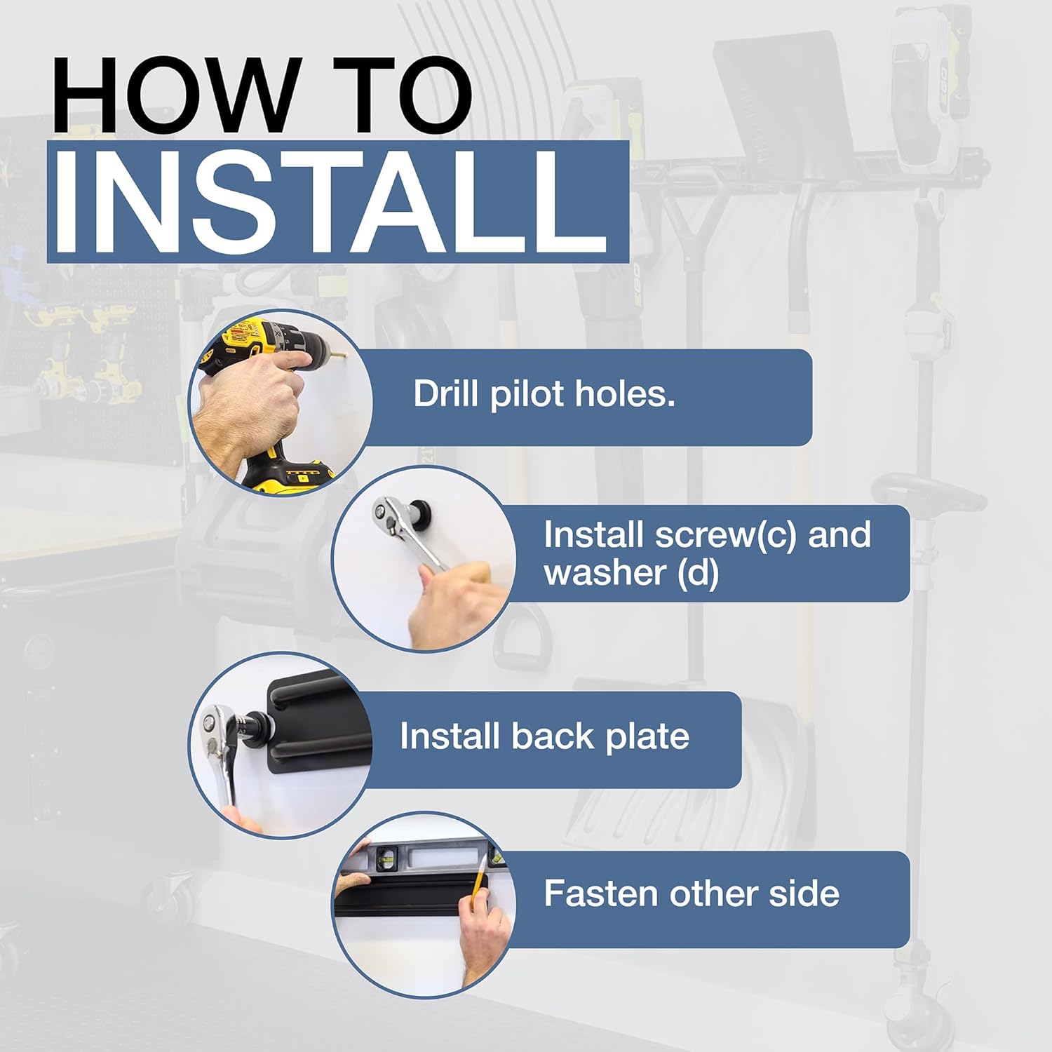 - EASY TO INSTALL & USE – This mop and broom holder wall mount installs directly into standard wall studs for secure hanging storage. Includes all hardware for a quick setup, making it simple to organize your garage shelving wall, shed organizer, or garage storage cabinet.