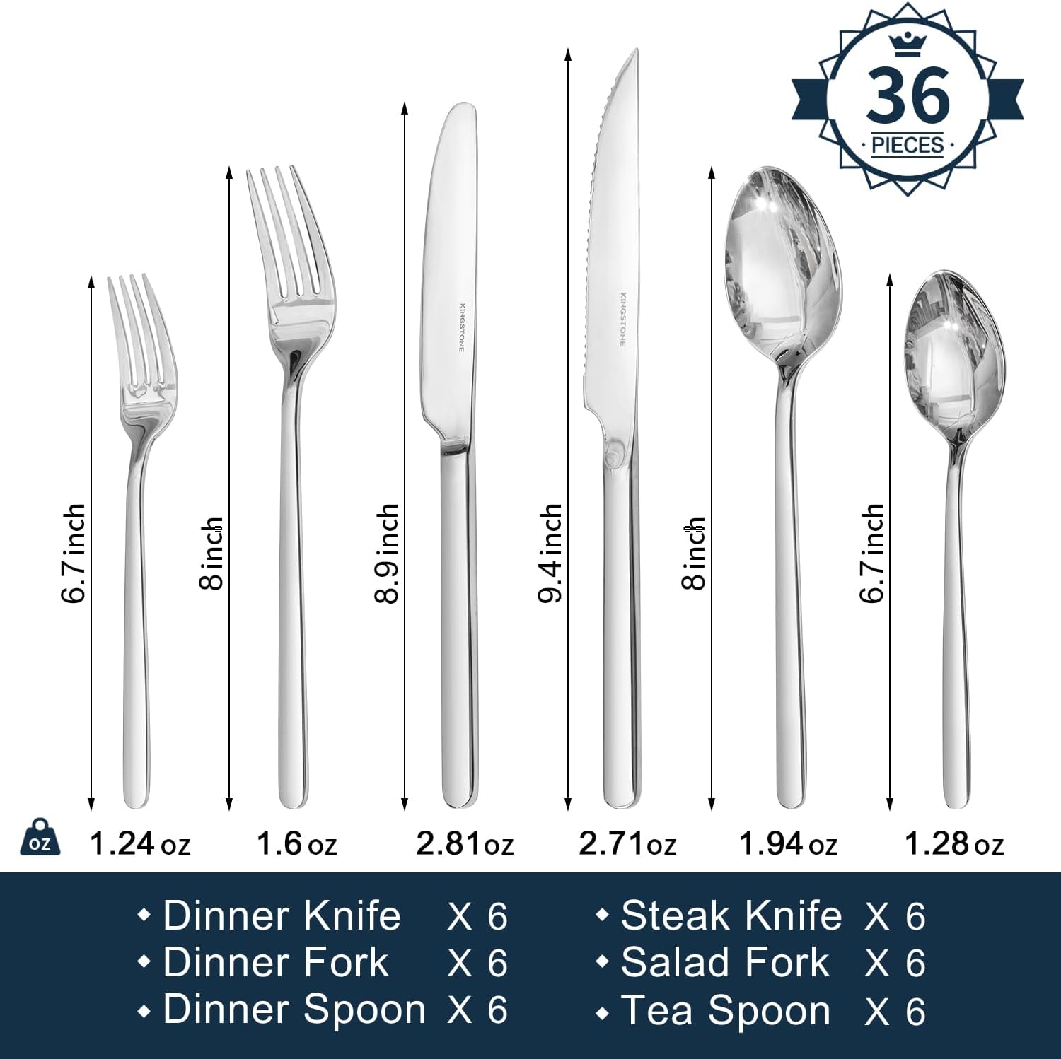 - 36PCS Silverware Set For 6 - Includes 6 dinner forks(8ββ/1.6oz), 6 salad forks(6.7ββ/1.24oz), 6 dinner knives(8.9ββ/2.81oz), 6 steak knives(9.4ββ/2.71oz), 6 dinner spoons(8ββ/1.94oz) and 6 teaspoons(6.7ββ/1.28oz). This silverware set is great for everyday use and also for a special dinner. Essential for families or restaurants