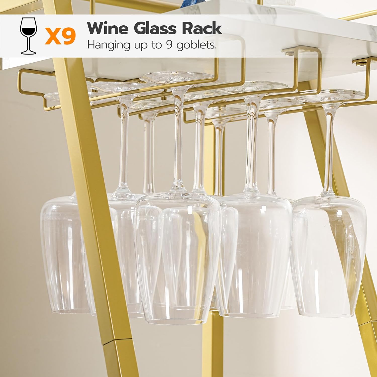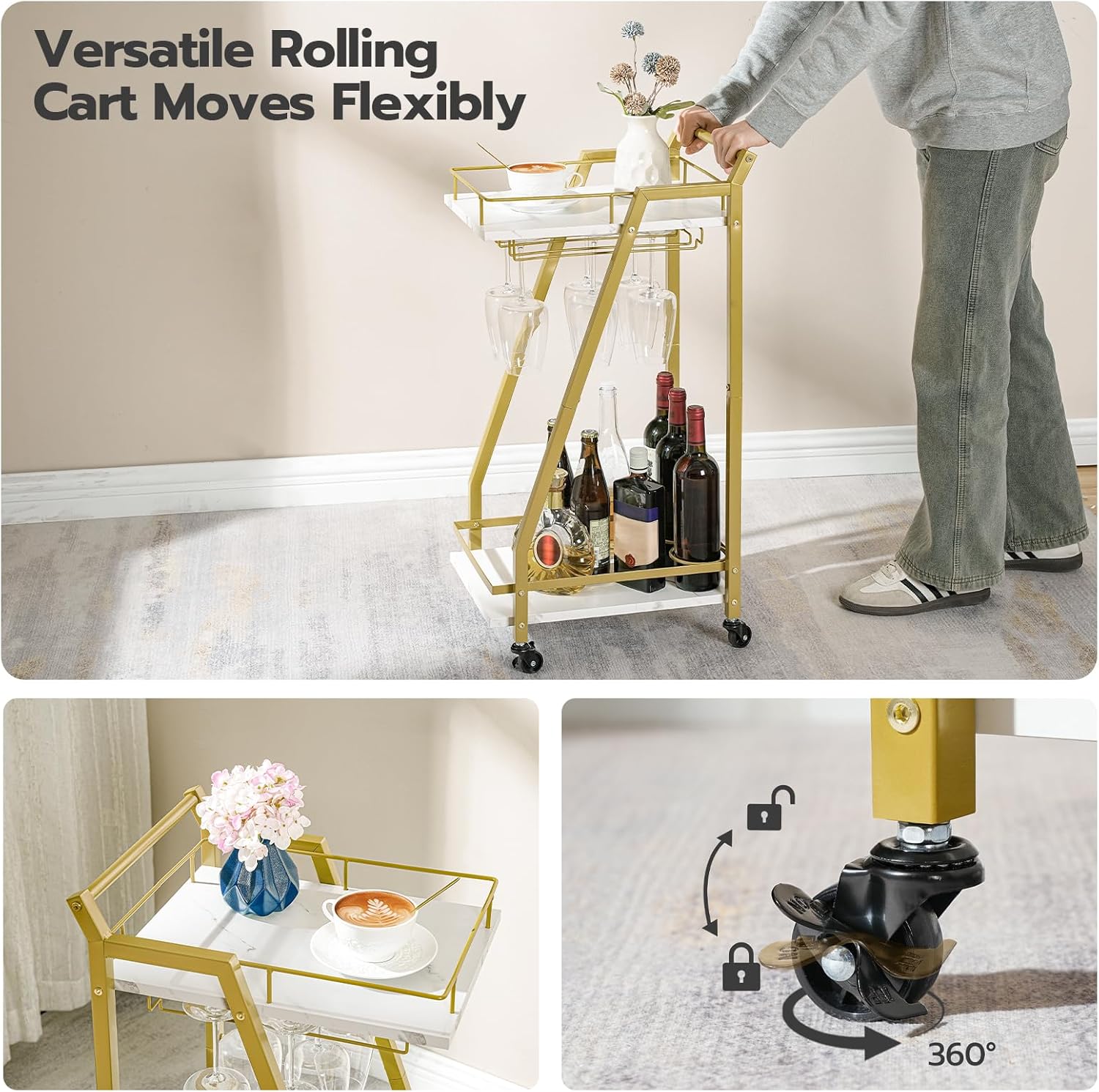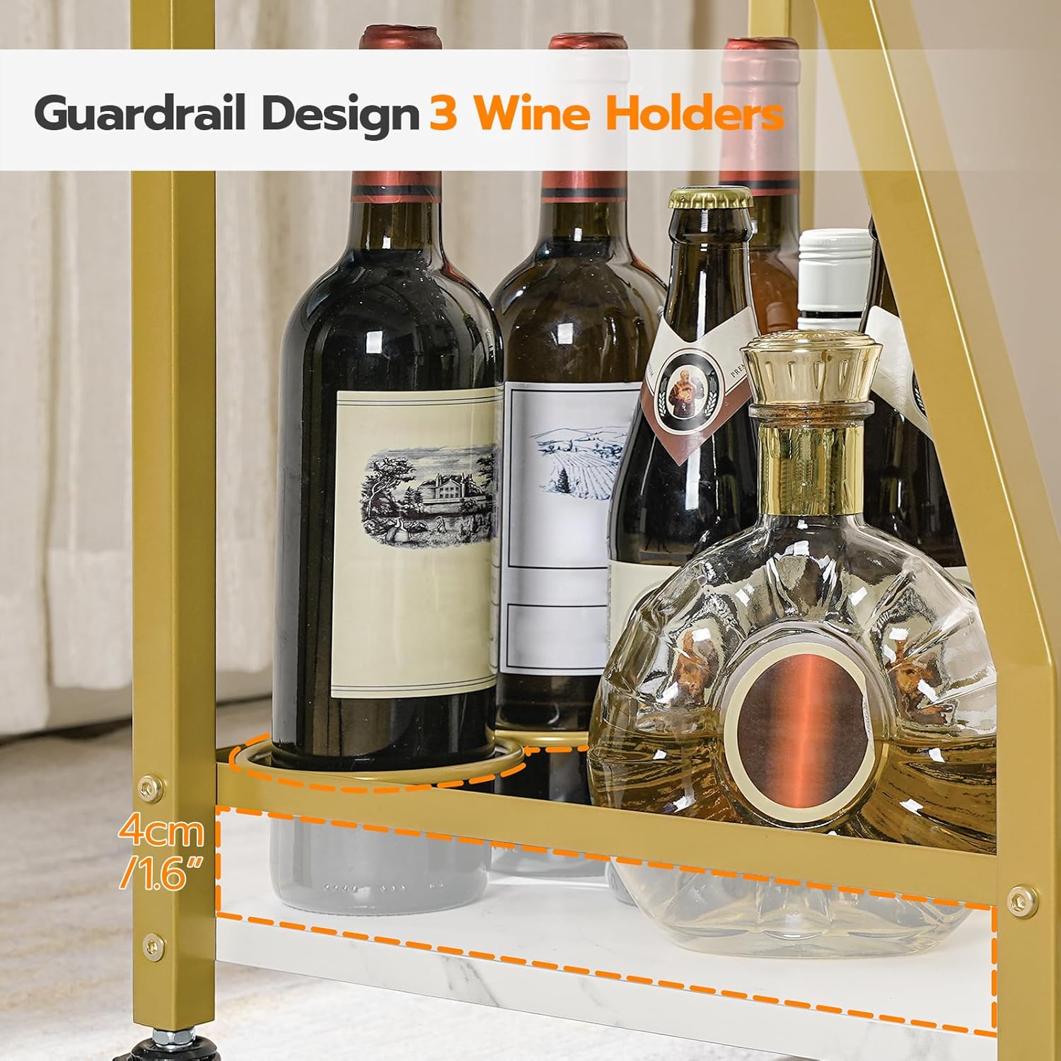 - Double Storage: The home bar cart features 2 spacious storage levels with guardrails to prevent items from falling accidentally. This gold bar cart also includes a wine rack and glass holder that can hold up to 3 bottles of wine and 9 glasses, providing easy access