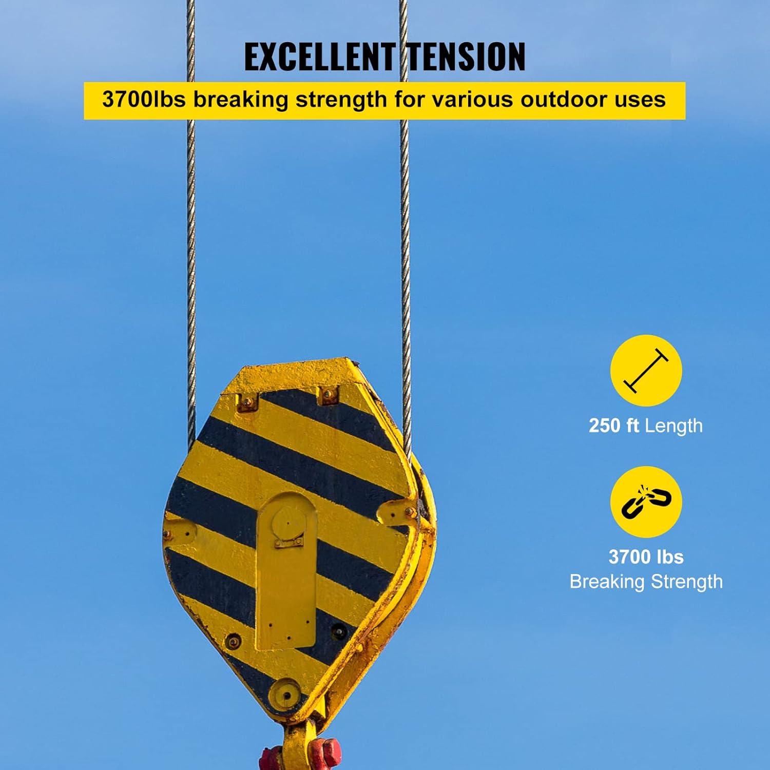- 3700lbs Breaking Strength: Diameter: 3/16". The breaking strength of our wire rope is very strong, up to 3700 lbs, which allows for a variety of hanging, strapping and DIY activities, perfect for long time use.