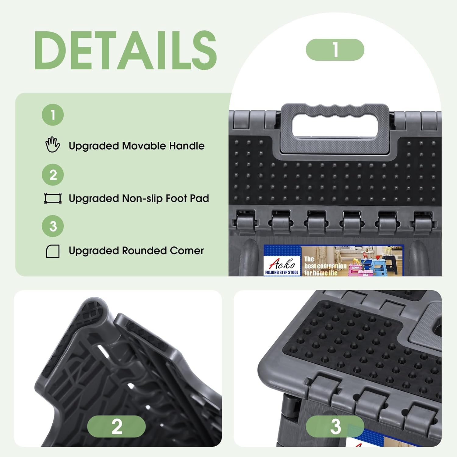 ACKO Folding Step Stool Foldable 16 Inch Stools for Adults and Kids, Plastic Stools Tall 400 lbs Capacity, Collapsible Stool for Kitchen, Stepping Foot Stool with Handle, Dot Grey, 1 PC