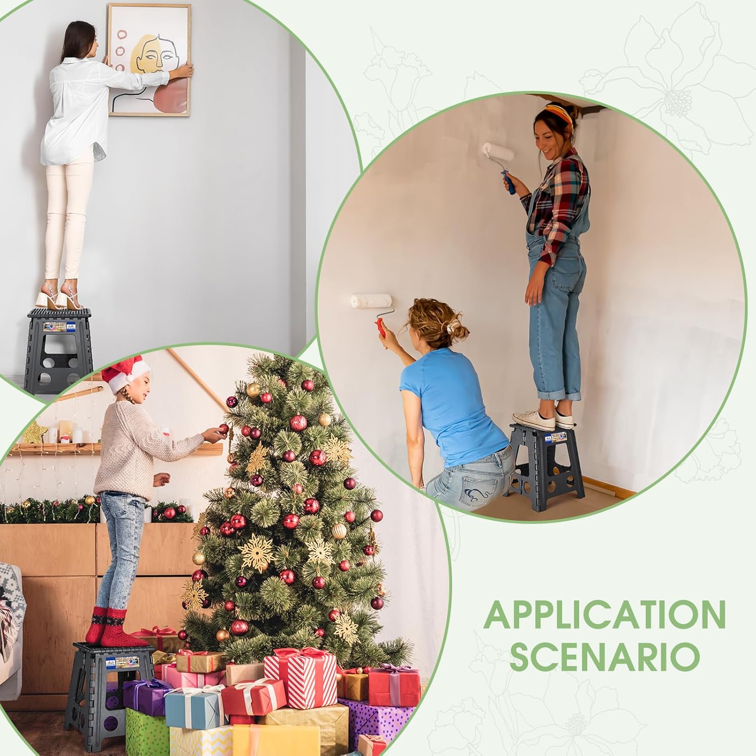 - 【Versatile and Multipurpose】Folding stool is suitable for a wide range scene, from indoors to outdoors, high enough for most reaching without a step ladder,catering to various needs comfortably,great for kitchen, closet, office, garden, RV, camping, fishing or anywhere else you might need a little extra height.