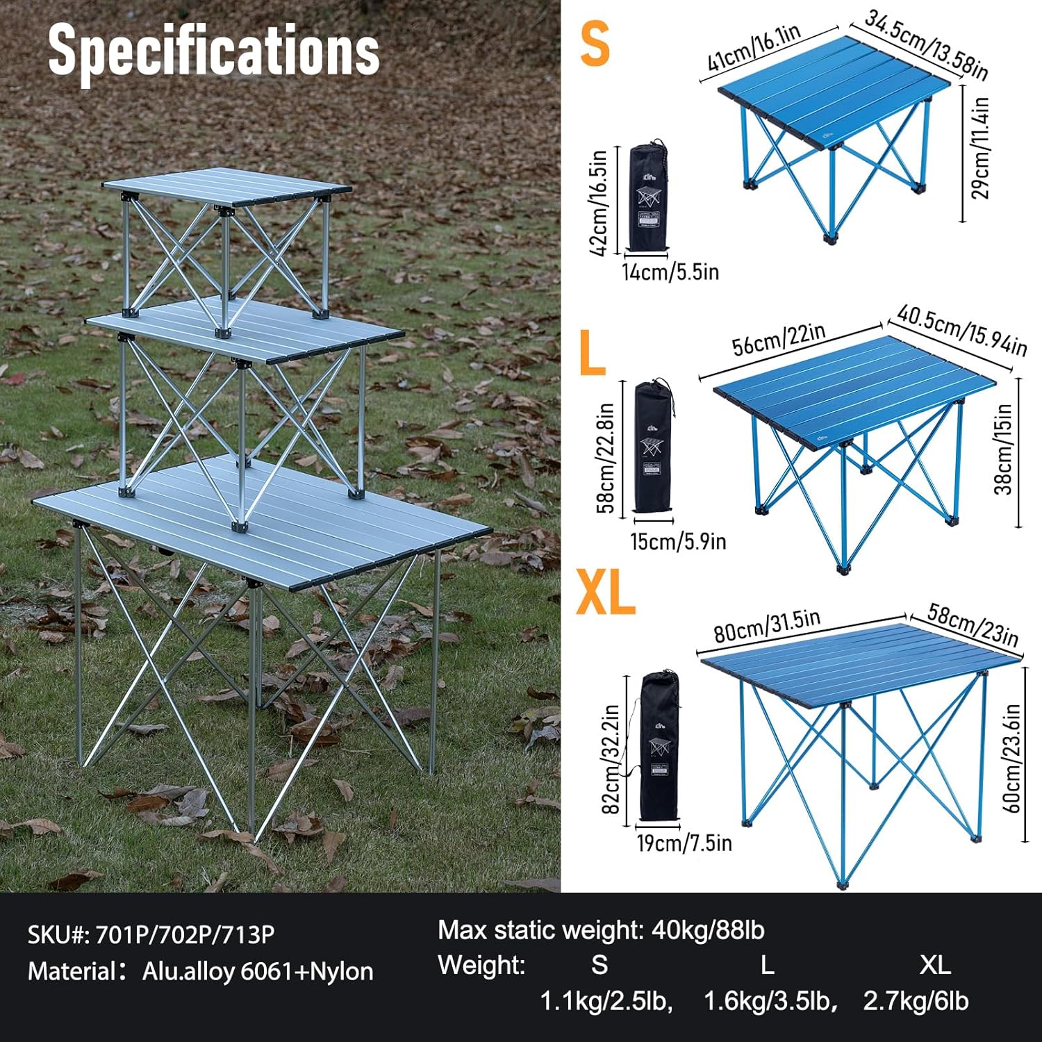 - Ultralight, made of aerospace-grade aluminum alloy, only 3.5 lbs; Max Load 88 lbs; Unlike wooden or nylon-top tables, this table is durable, waterproof, corrosion-resistant, easy to clean; Sturdy joints and anti-slip feet keep the table stable, with legs that wonโt fold, bend, or slip on any terrain; Very easy to set up, just open the base frame and attach the tabletop, enjoy your leisure time in seconds, video guide available on this page.