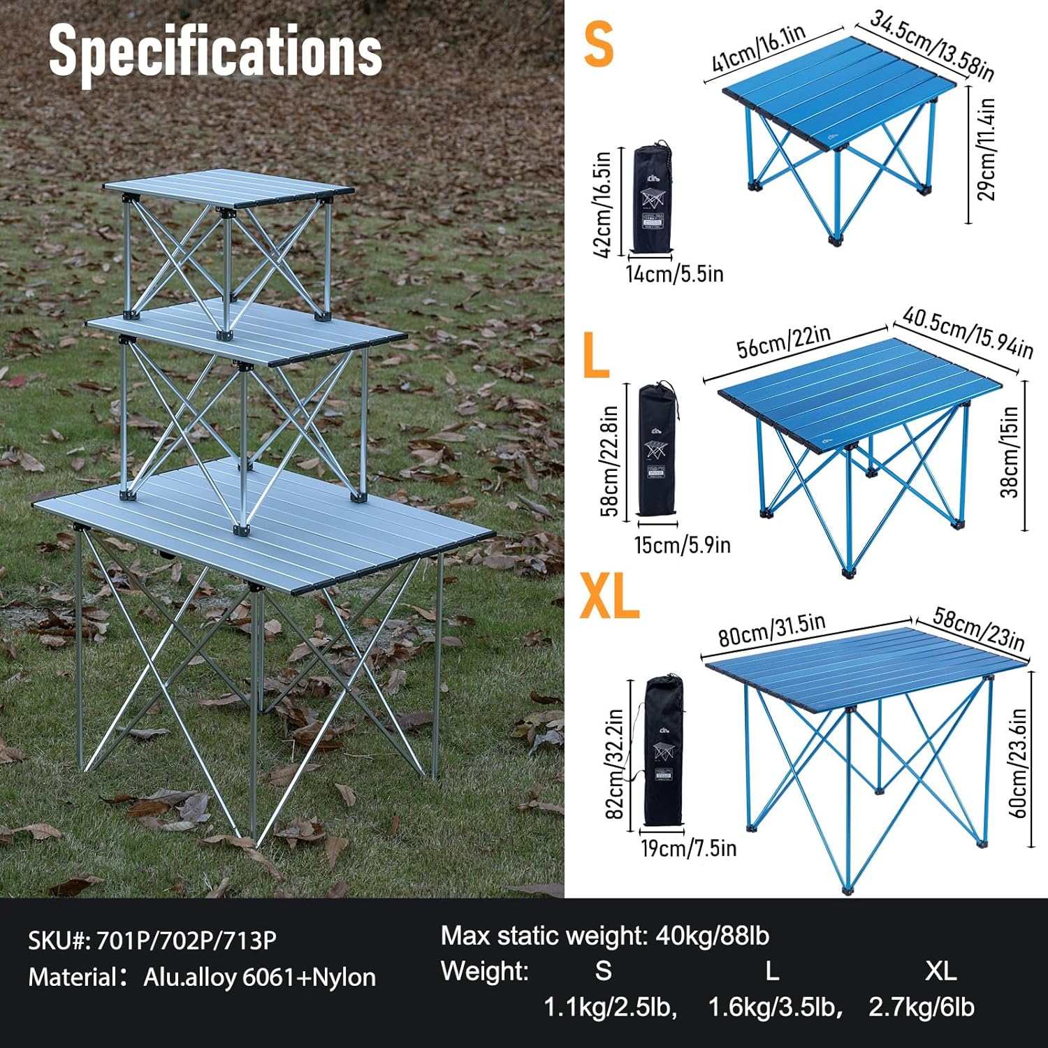 - Lightweight, made of aerospace-grade aluminum alloy, only 6 lbs; Max Load 88 lbs; Unlike wooden or nylon-top tables, this table is durable, waterproof, corrosion-resistant, easy to clean; Sturdy joints and anti-slip feet keep the table stable, with legs that wonโt fold, bend, or slip on any terrain; Very easy to set up, just open the base frame and attach the tabletop, enjoy your leisure time in seconds, video guide available on this page.