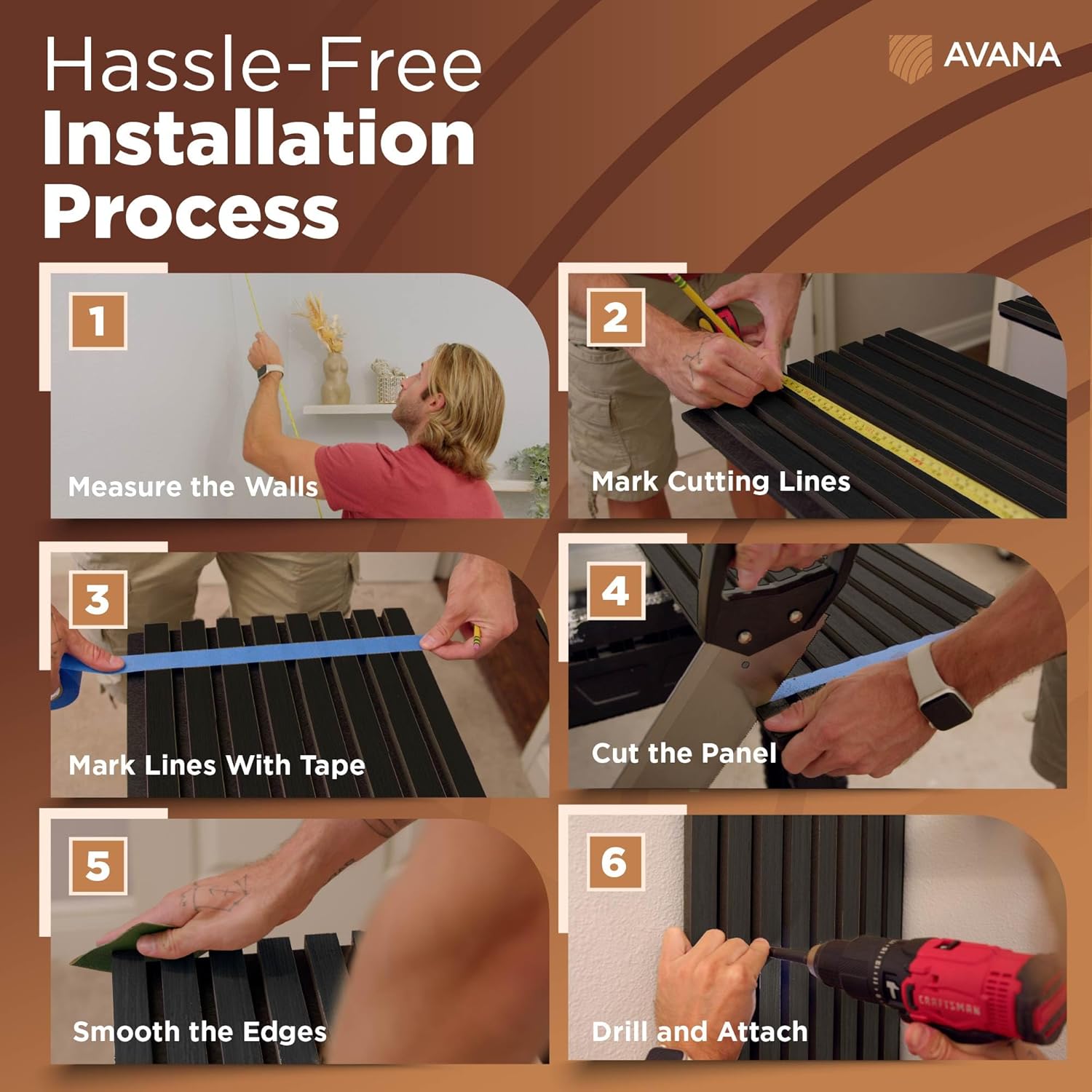 - Effortless Installation — Simplify your journey to acoustic excellence with Avana panels wall decor. Enjoy the convenience of quick and easy installation of wood panels. Whether mounted on walls or ceilings, these wall wood panels bring instant acoustic enhancement to your space. Bid farewell to complex installation processes and embrace a hassle-free experience with Avana wall soundproofing panels that save you time, ensuring your acoustic journey begins with our fluted wood panels.