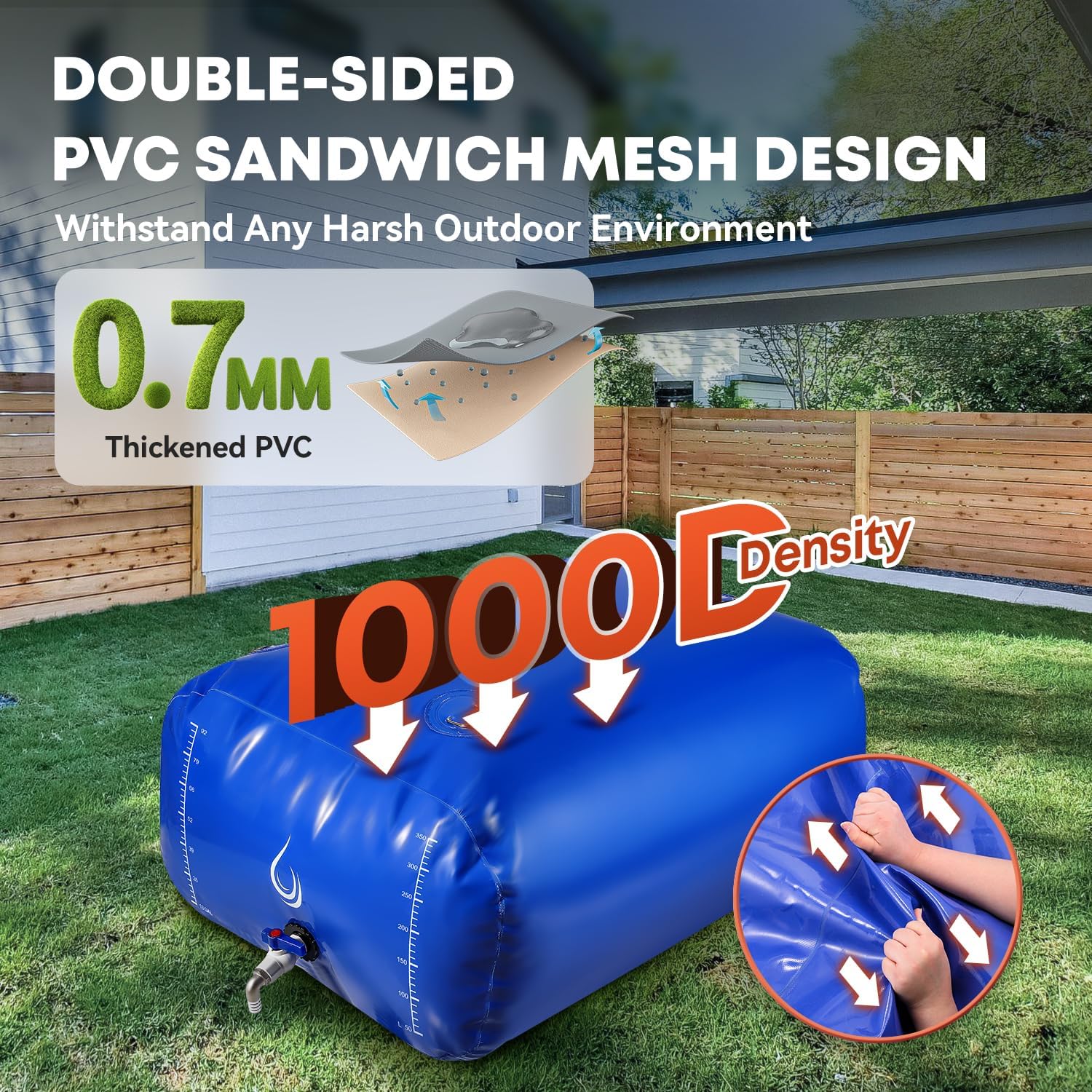 - Premium And Durable Our collapsible water tank is made of 1000D fabric with 0.7mm thickened PVC. This high-quality product features a robust and durable design with a high-frequency welded sealing structure, and can withstand any harsh weather conditions and extreme temperatures. Adaptation Temperature: -22°F to 158°F.