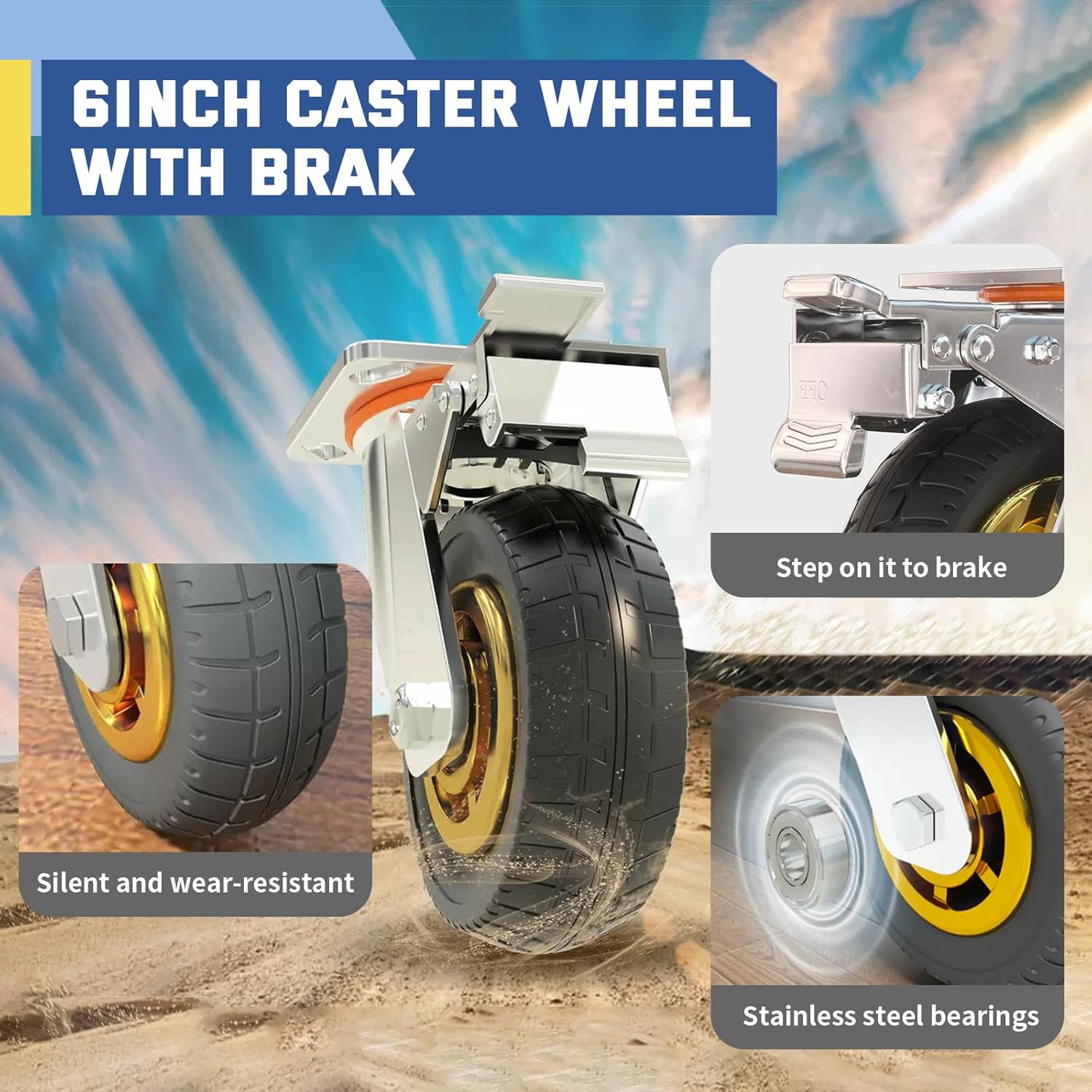 - 6Inch Maneuverable Wheels: High-quality 2PCS rigid wheels + 2PCS swivel wheels with brakeenable smooth movement, making platform truck easier to transport barrels without excessive effort. The silent wheels of platform truck cart are designed to roll smoothly on different surfaces, including concrete, tile, or carpet.