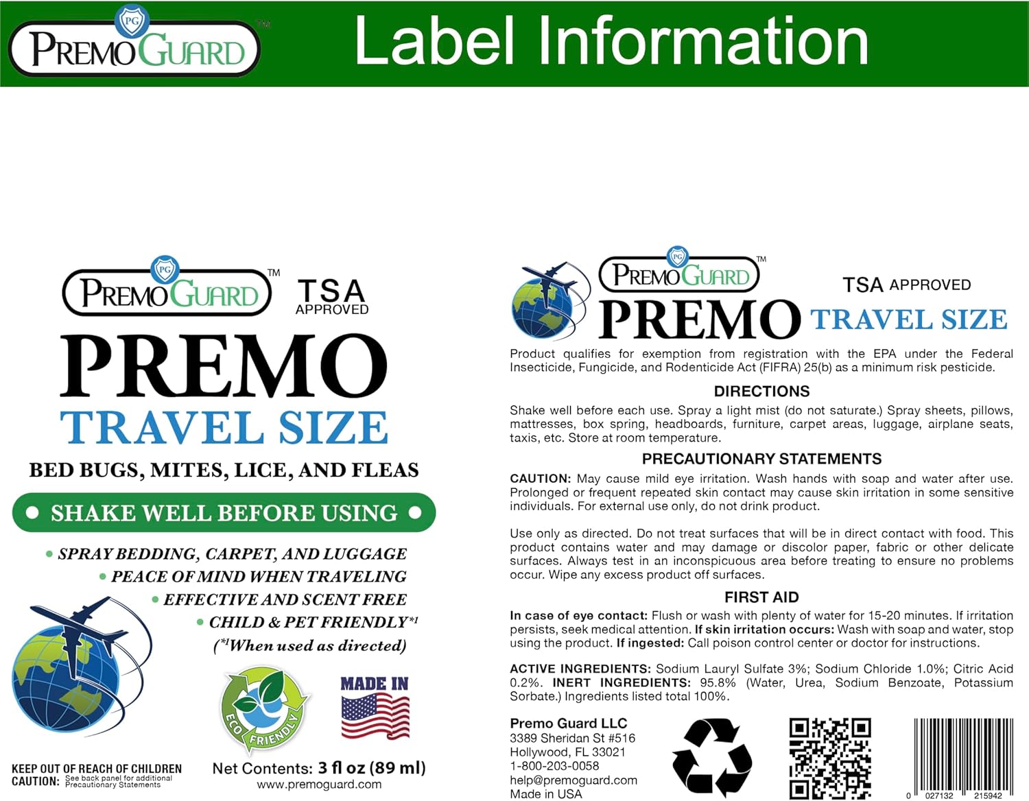 Premo Guard Travel Bed Bug, Mite & Lice Spray 3 oz - TSA Carryon Approved - Natural Stain & Odor Free - Public Transportation, Accommodations & Luggage - Chid & Pet Safe (3 Pack)