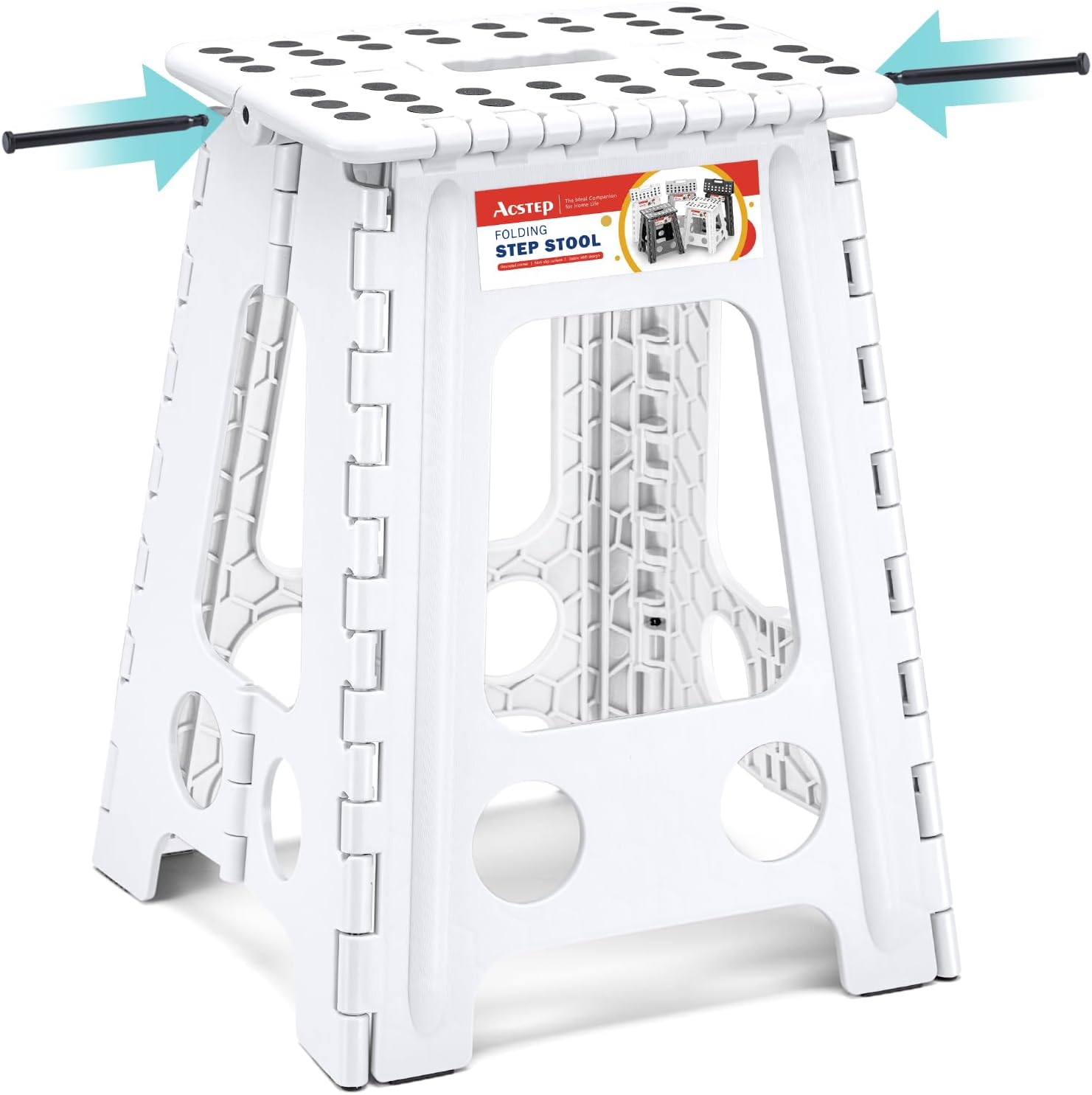 ACSTEP Folding Step Stool 17.5 Inch Heavy Duty Step Stool Foldable for Adults and Kids, Collapsible Stepping Stool with Handle, Non Slip Folding Stools for Kitchen Hold Up to 400lbs (White 1PC)