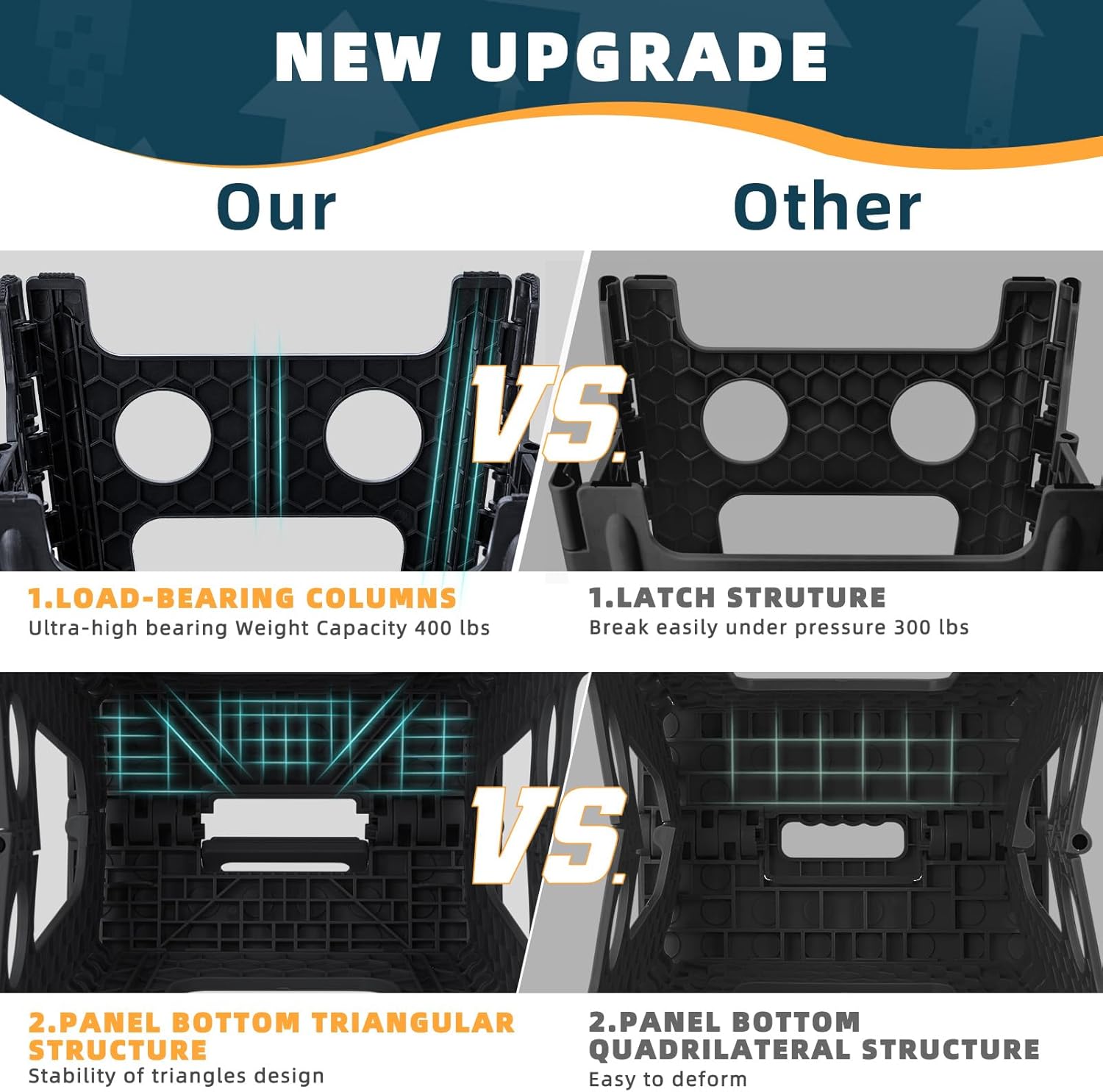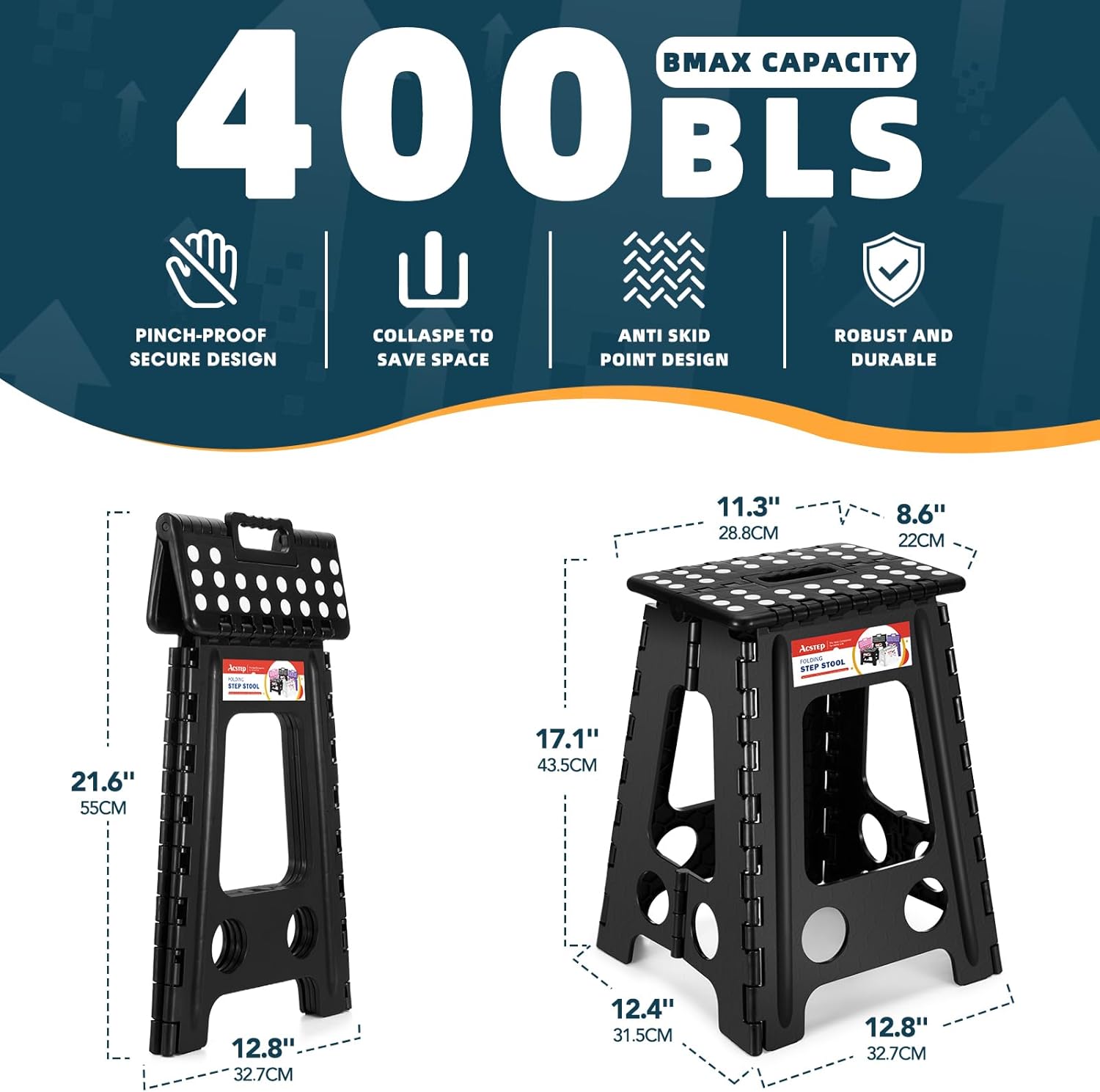 - Loads Up to 400lbs: ACSTEP pin structure stool is patented. Folding step stool has been reinforced with locking pins and fixed hinges to prevent danger of falling off and enhance stability and bearing capacity effectively. Inner honeycomb structure is uniquely designed in such a way that makes the stool extra strong and safe. Tested to hold up to 400 LBS, this folding stool offers great stability even when loaded.