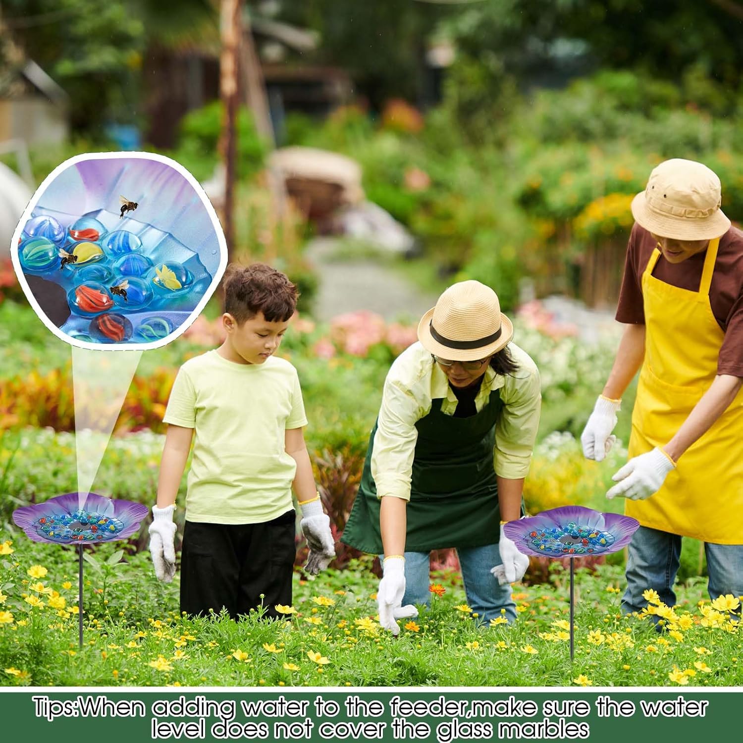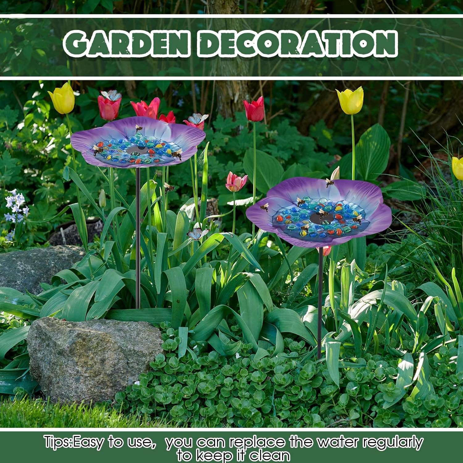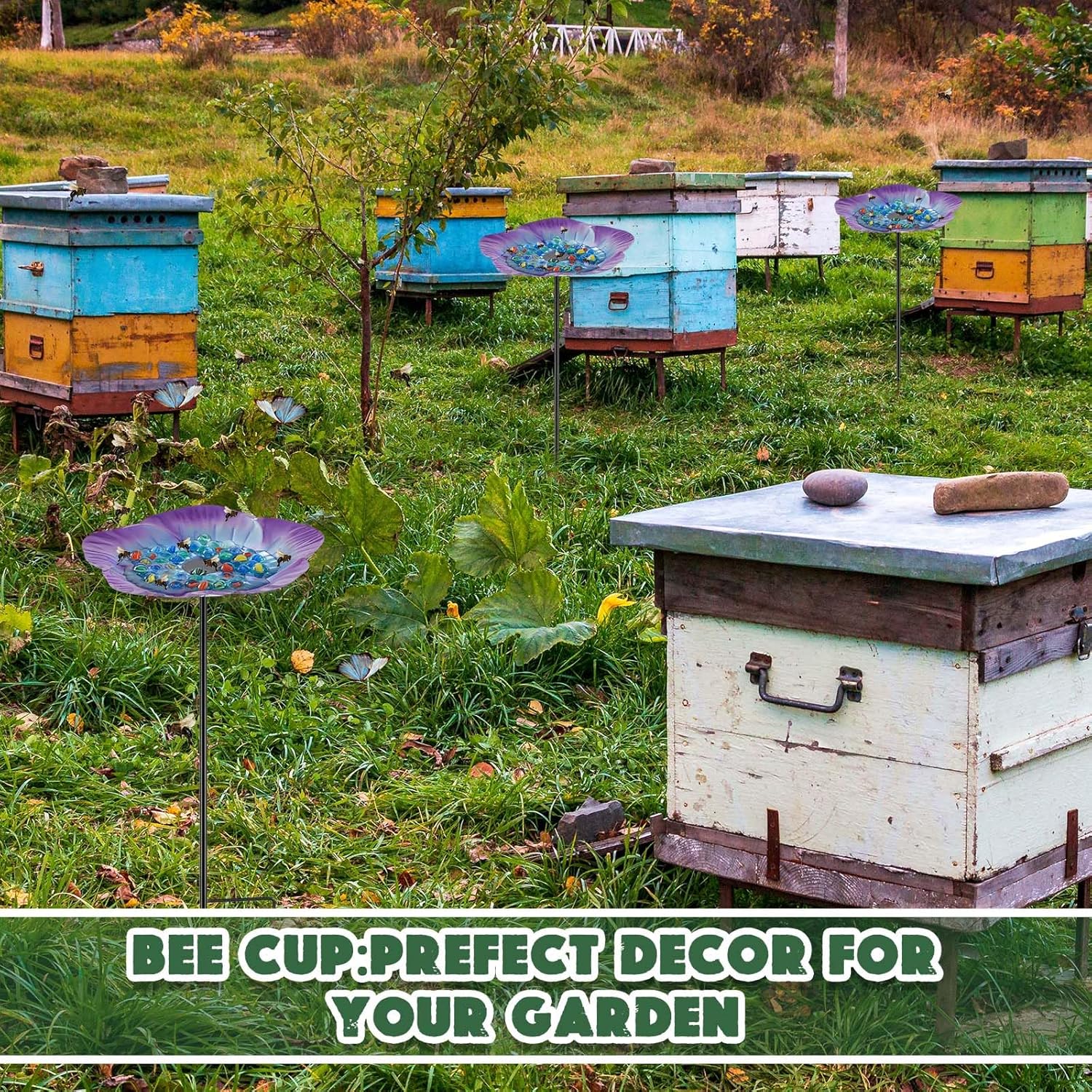 Tandefio Vivid Flower Bee Watering Station Metal Butterfly Water Feeder Cup with 30 Colorful Glass Marbles Bee Feeder Butterfly Bath Bowl for Garden Outdoor Yard Decors(Blue Purple,Flower)