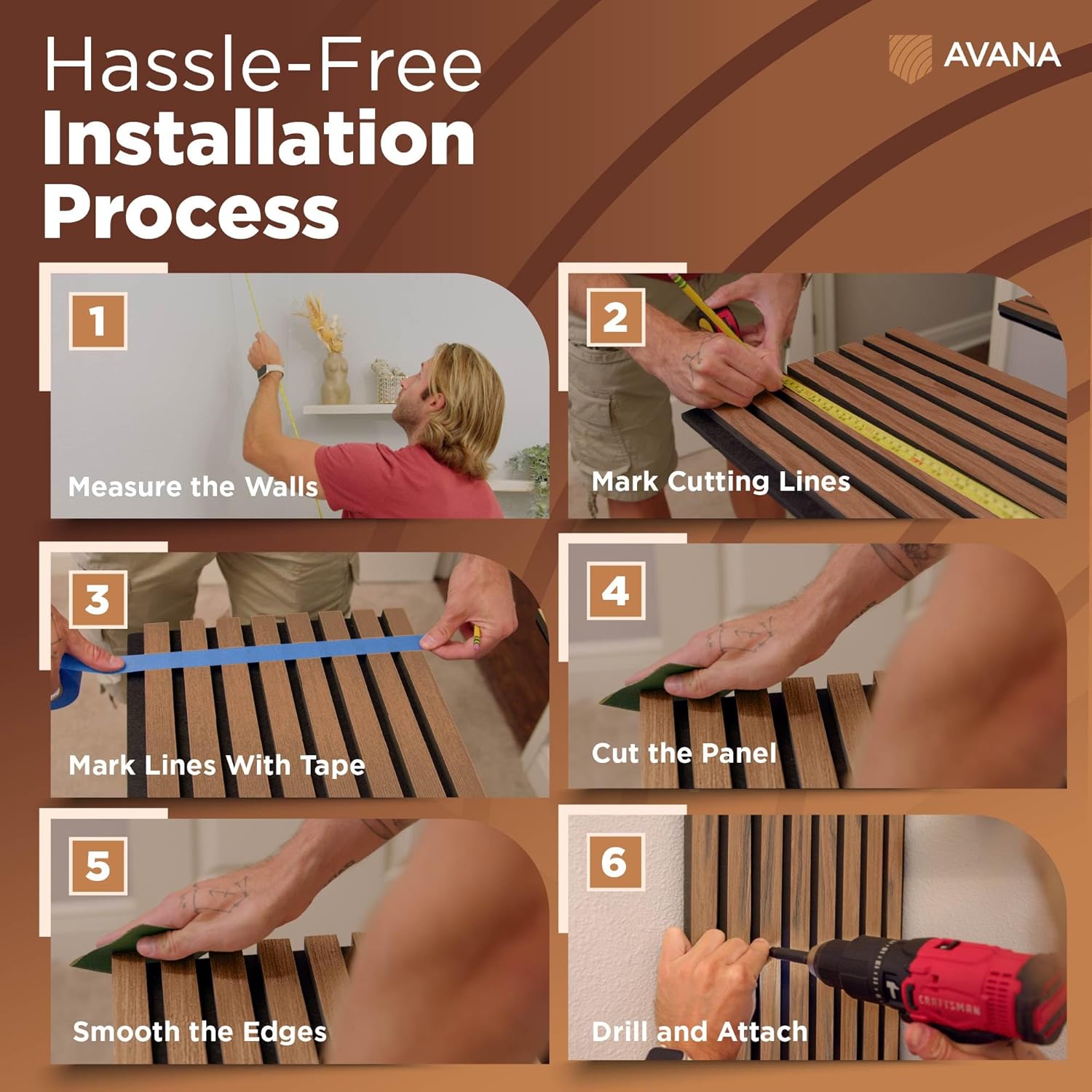- Effortless Installation — Simplify your journey to acoustic excellence with Avana panels wall decor. Enjoy the convenience of quick and easy installation of wood panels. Whether mounted on walls or ceilings, these wall wood panels bring instant acoustic enhancement to your space. Bid farewell to complex installation processes and embrace a hassle-free experience with Avana wall soundproofing panels that save you time, ensuring your acoustic journey begins with wood slat acoustic panels for wall.