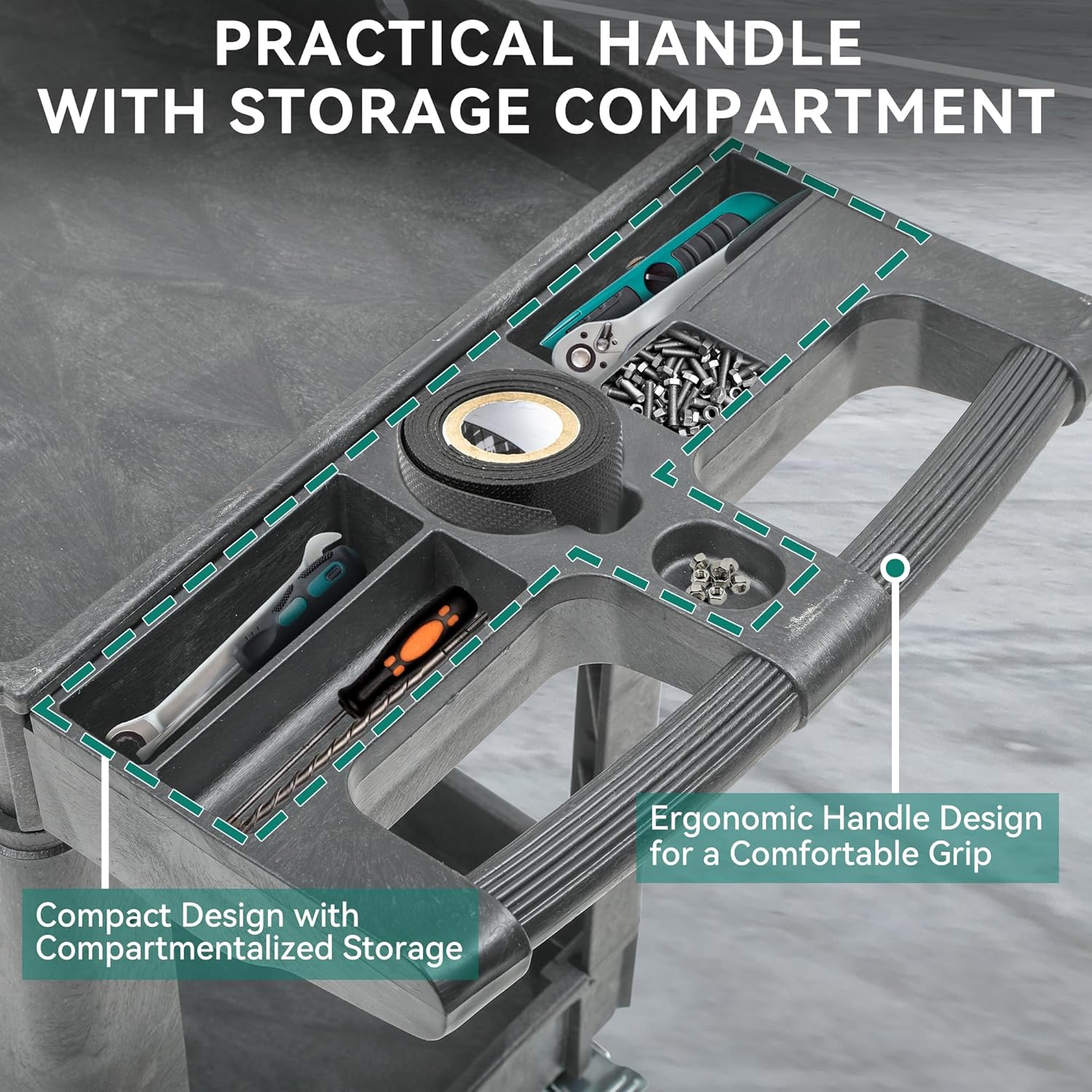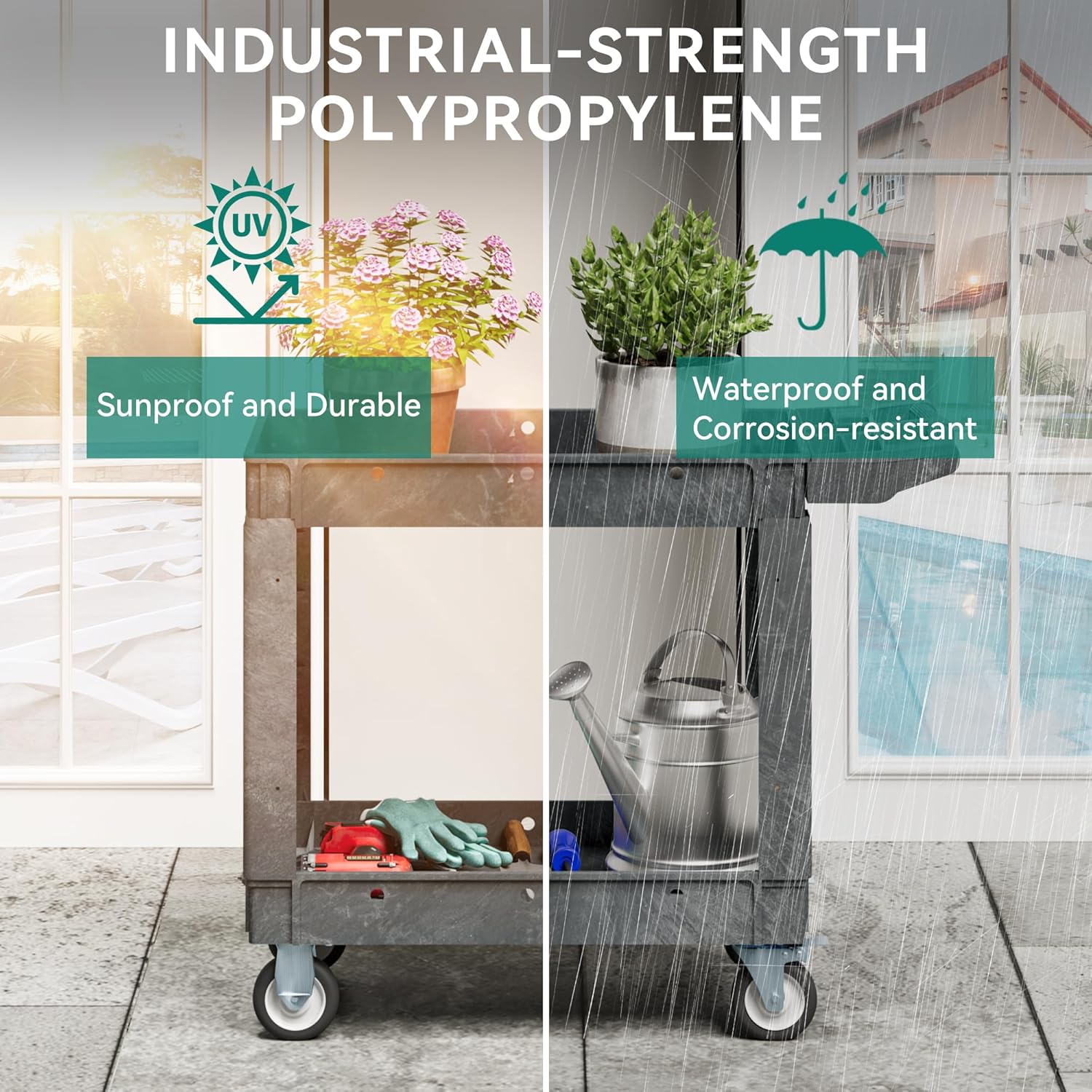 - RAIN & SUN PROTECTION: The plastic utility carts are made of rainproof material with a protective coating that protects the cart from rain and sun. Whether indoors or outdoors, the cart will not deform. This rolling work carts with wheels is also designed with round corners for safety of user, furnitures and walls.