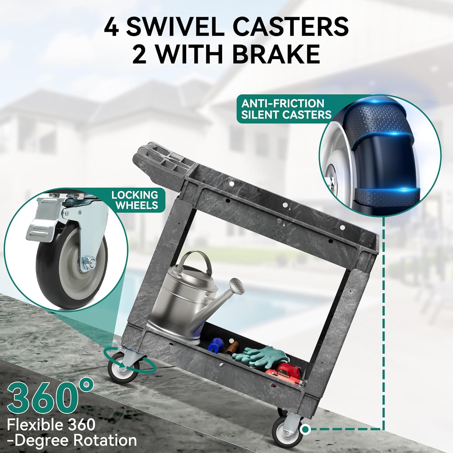 - LOCKING WHEELS: This utility service cart 2 shelf with four 5-inch swivel casters made of industrial-strength polypropylene for smoothness and durability, and two of them are lockable for 360-degree flexibility and labor-saving transportation. Meanwhile, the exterior thermoplastic rubber wrap not only absorbs vibration and reduces noise, but also prevents floor scratches and carpet snags.
