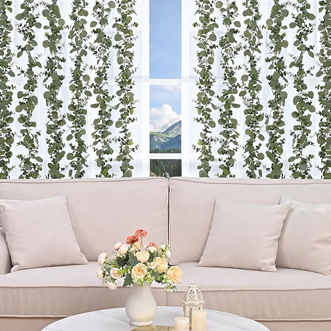 - 🌿PREMIUM MATERIAL: Made with high-quality silk leaves and plastic vine. The greenery garland won't wilt, fade or get easily damaged. These eucalyptus garlands have uv resistant, non-toxic and waterproof function. Each leaf is hand assembled and you can pop them right back on if some of the leaves fall.