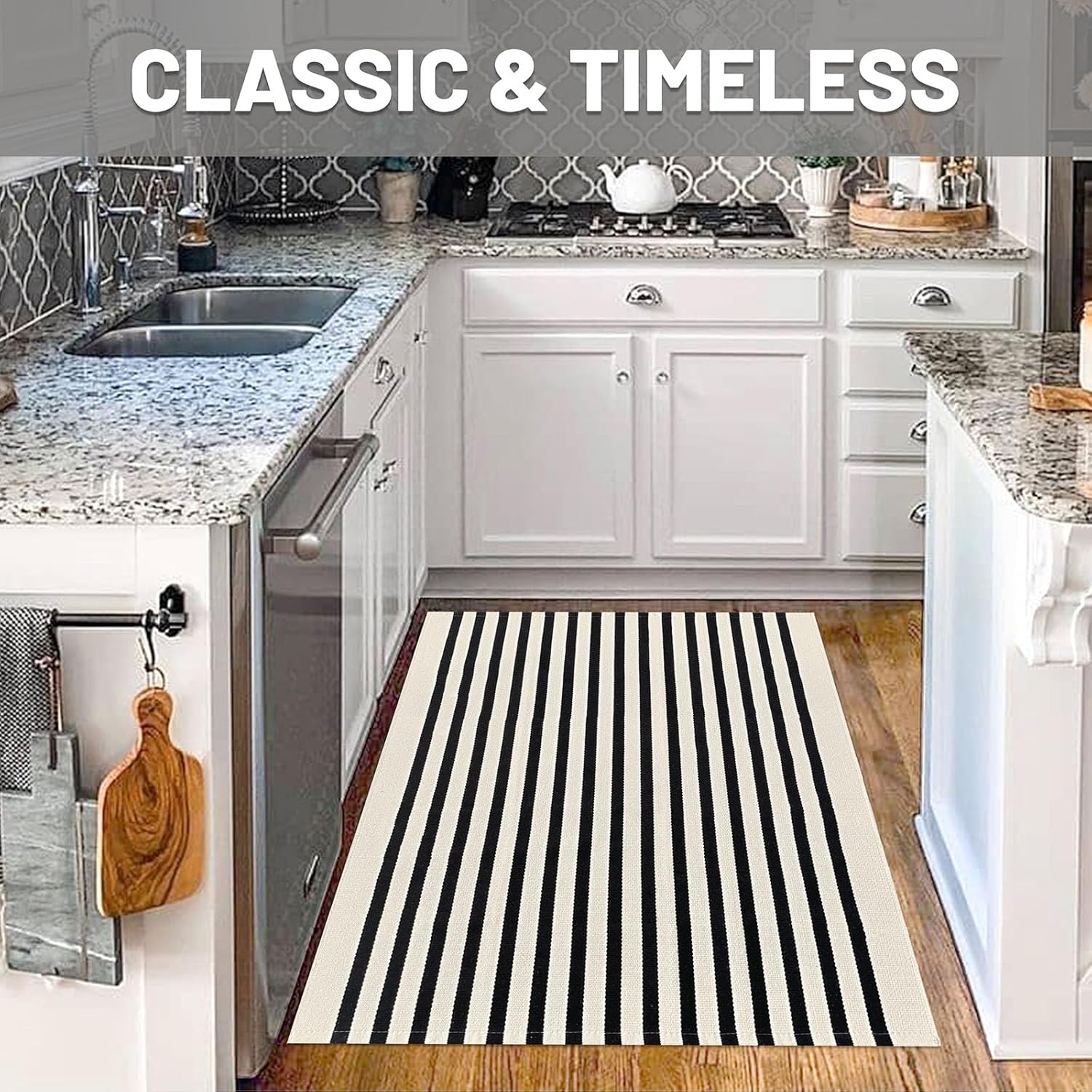 - Easy to Clean: This light beige and black striped rug is simple to maintain with machine wash or vacuuming to remove dirt. The rug is sturdy and can be tumble dried on low. Keep your door rug fresh and clean with minimal effort. NOTE: Cotton rugs normally shrink slightly after washing