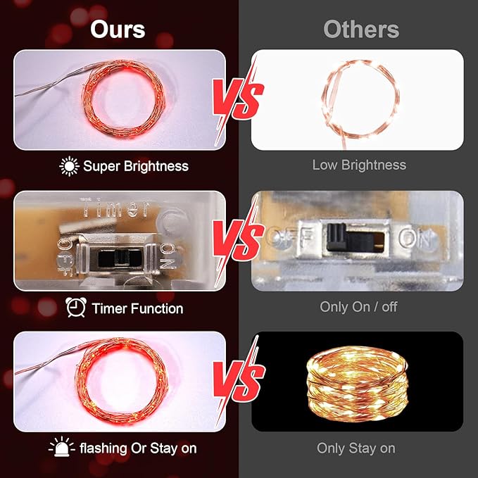 2 Pack 16.4ft Battery Operated String Lights with Timer, Red with Synchronized Twinkle Mode, Fairy Lights Battery Powered, 50 LEDs, Idea for Christmas Bedroom Party Wedding