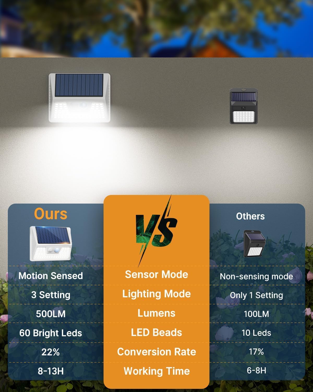 - 【Faster Charging-Longer Lighting】:This solar motion activated security light boasts a supercharged solar panel with a 20-22% conversion rate, meaning it charges up quicker during the day. That translates to longer illumination at night, keeping your outdoor space brightly lit for enhanced safety and security