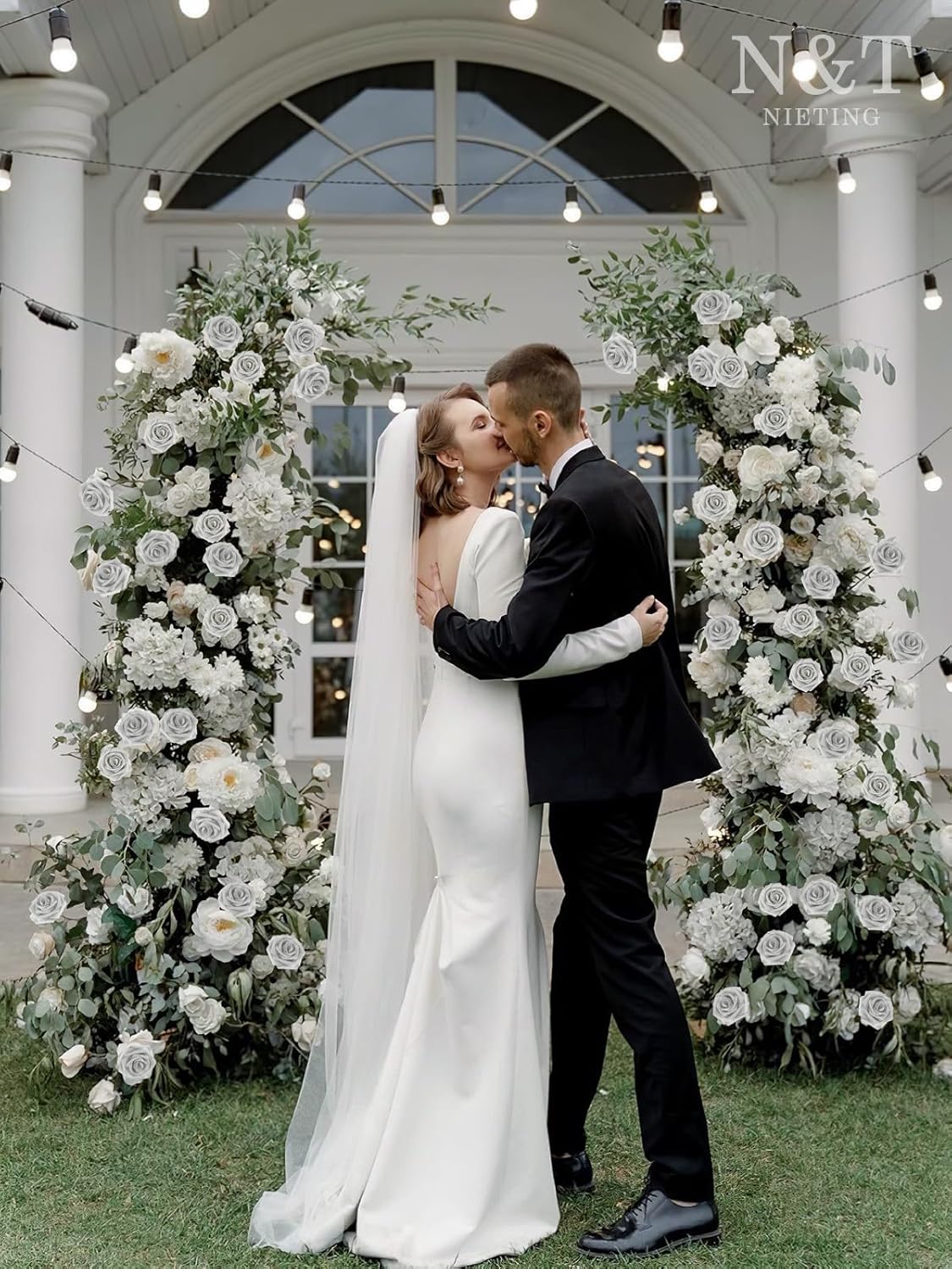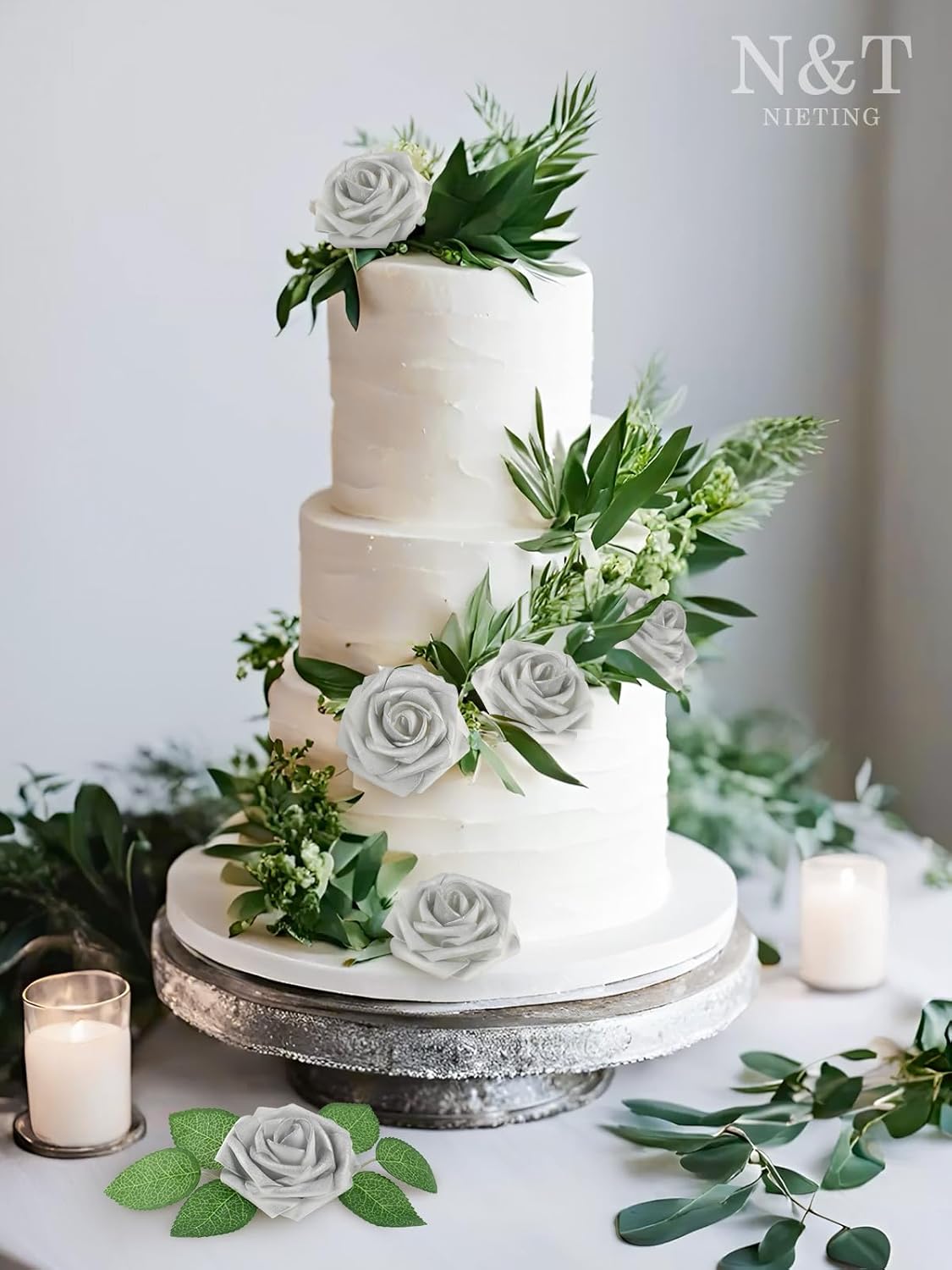 N&T NIETING Artificial Flowers, 50pcs Fake Flowers Roses with Stem for DIY Wedding Bouquets Centerpieces Bridal Shower Party Home Decoration, Silver White