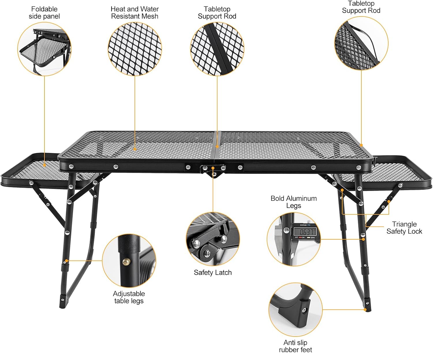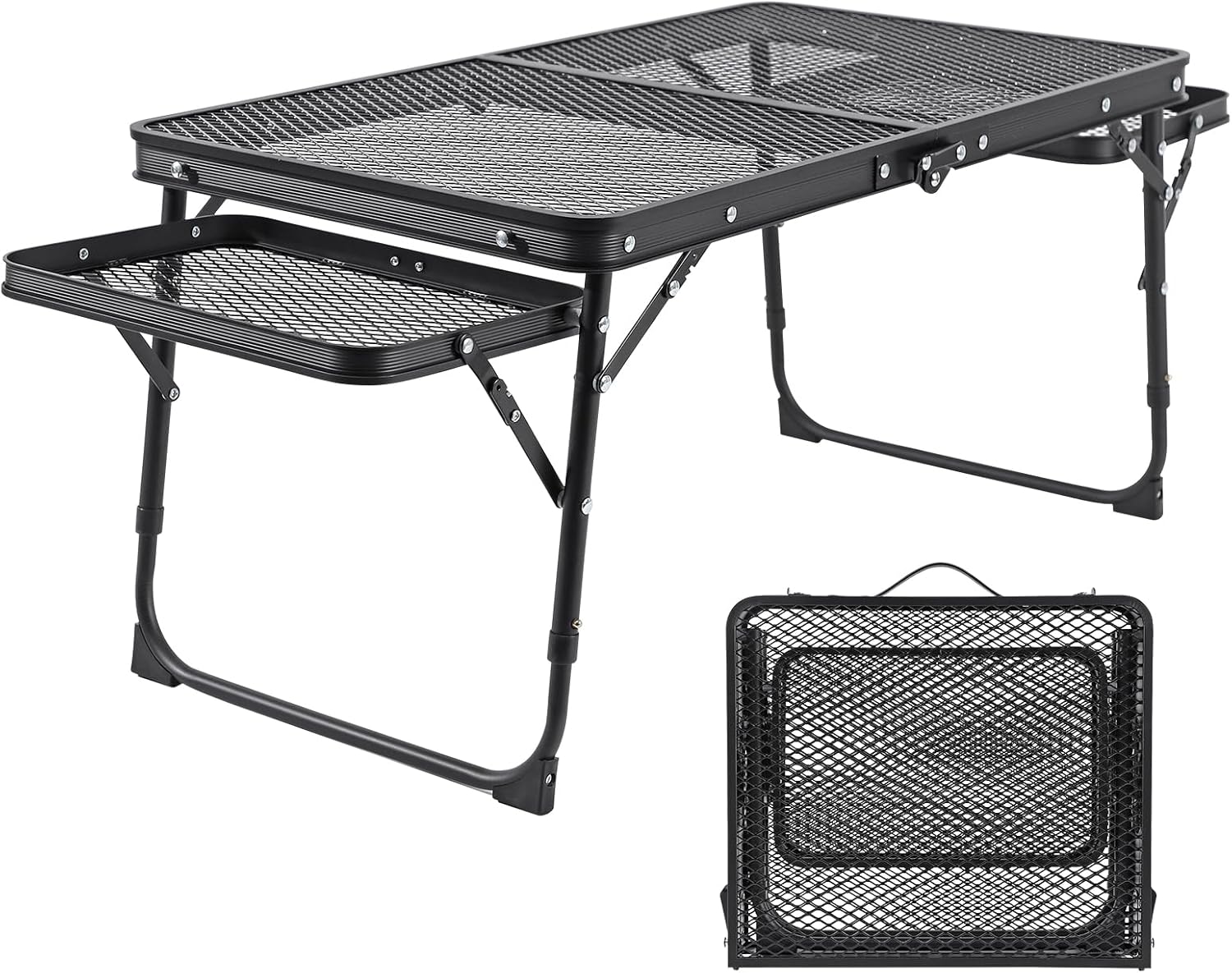 Camping Table Grill Table with Table Extension Board Adjustable Height Folding Tables Mesh Top Portable Grill for Outdoor Indoor Beach BBQ Picnic Travel RV Black