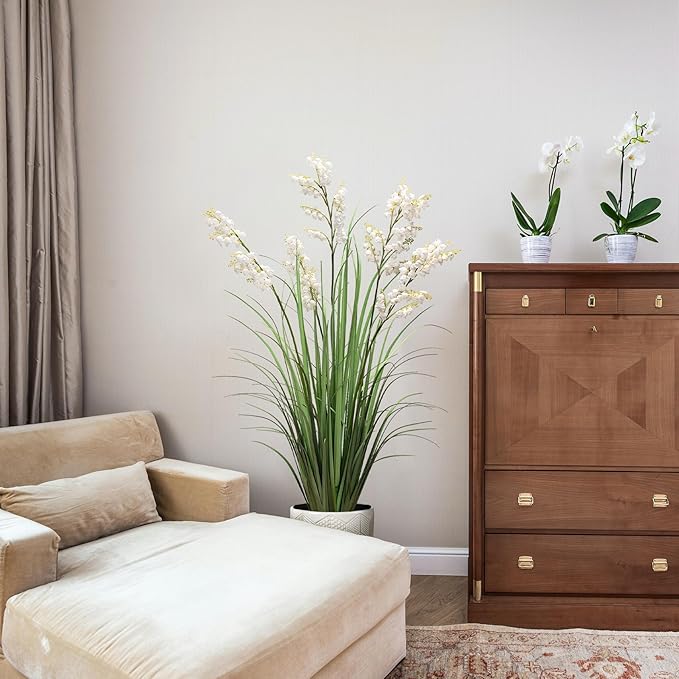 - Lifelike Design Details: This artificial plant stands out with its meticulous craftsmanship. The 47-inch height of these tall fake plants is perfectly proportioned, mimicking the natural growth of real grass. The PVC leaves and silk petals work together to create a texture that’s hard to distinguish from live foliage. As an artificial grass plant, it features leaves that sway gently with the breeze, adding a dynamic touch. These faux plants, bring a sense of authenticity to any space.