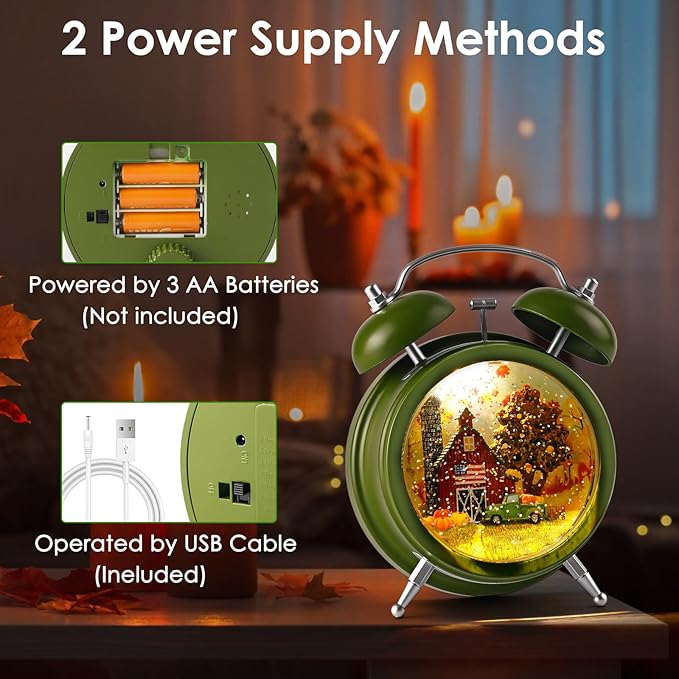 Alarm Clock Fall Snow Globe, Lighted Snow Globe Lantern 6H Timer Thanksgiving Snow Globe Thanksgiving Decorations Fall Decor (Green)