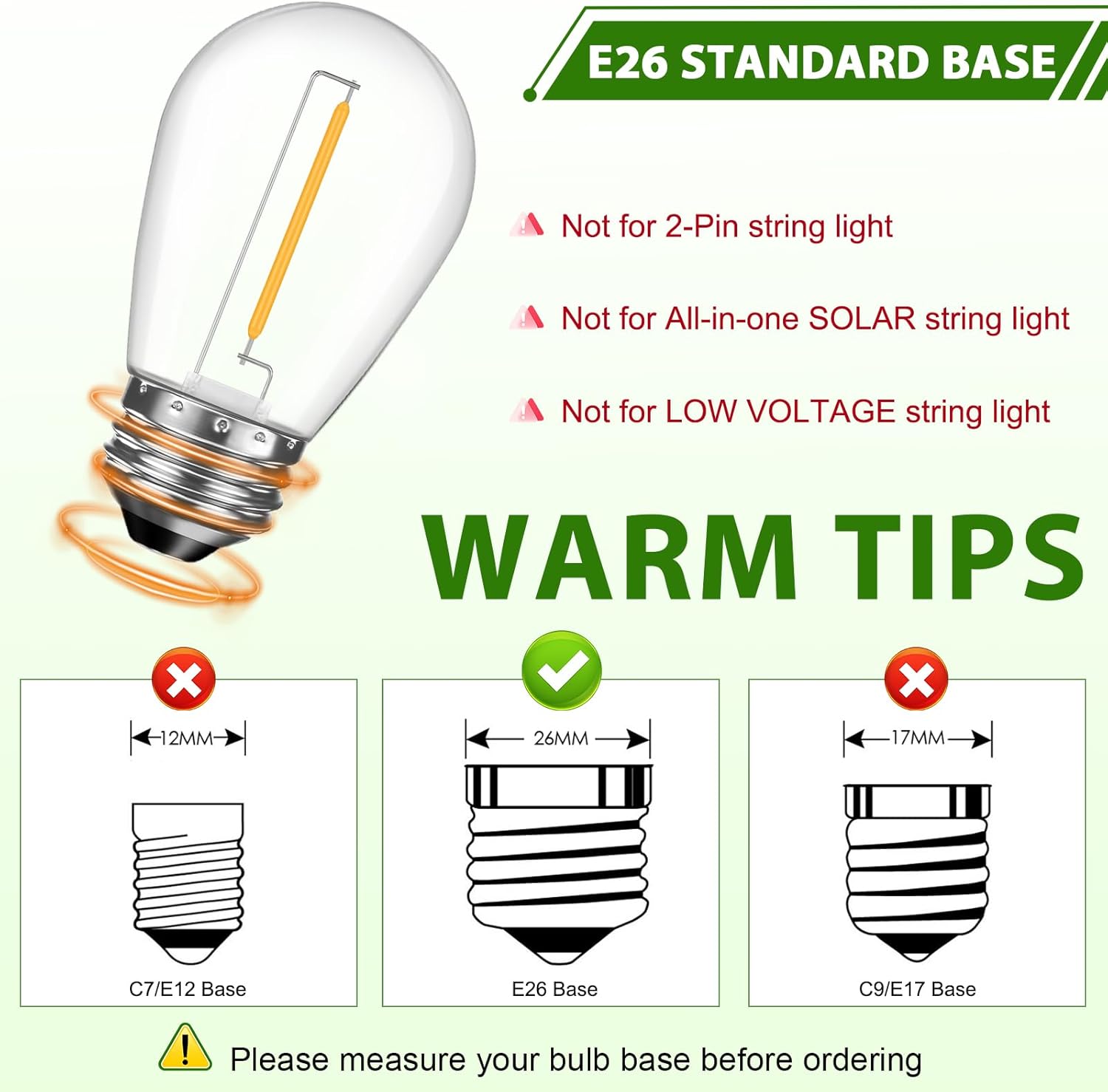 - 【Easy Installation】S14 light bulbs are designed with a standard E26 screw base that makes them compatible with most light fixtures, you just need to screw bulbs into the empty sockets, then you can enjoy the vintage atmosphere. (Do not work with solar string lights)