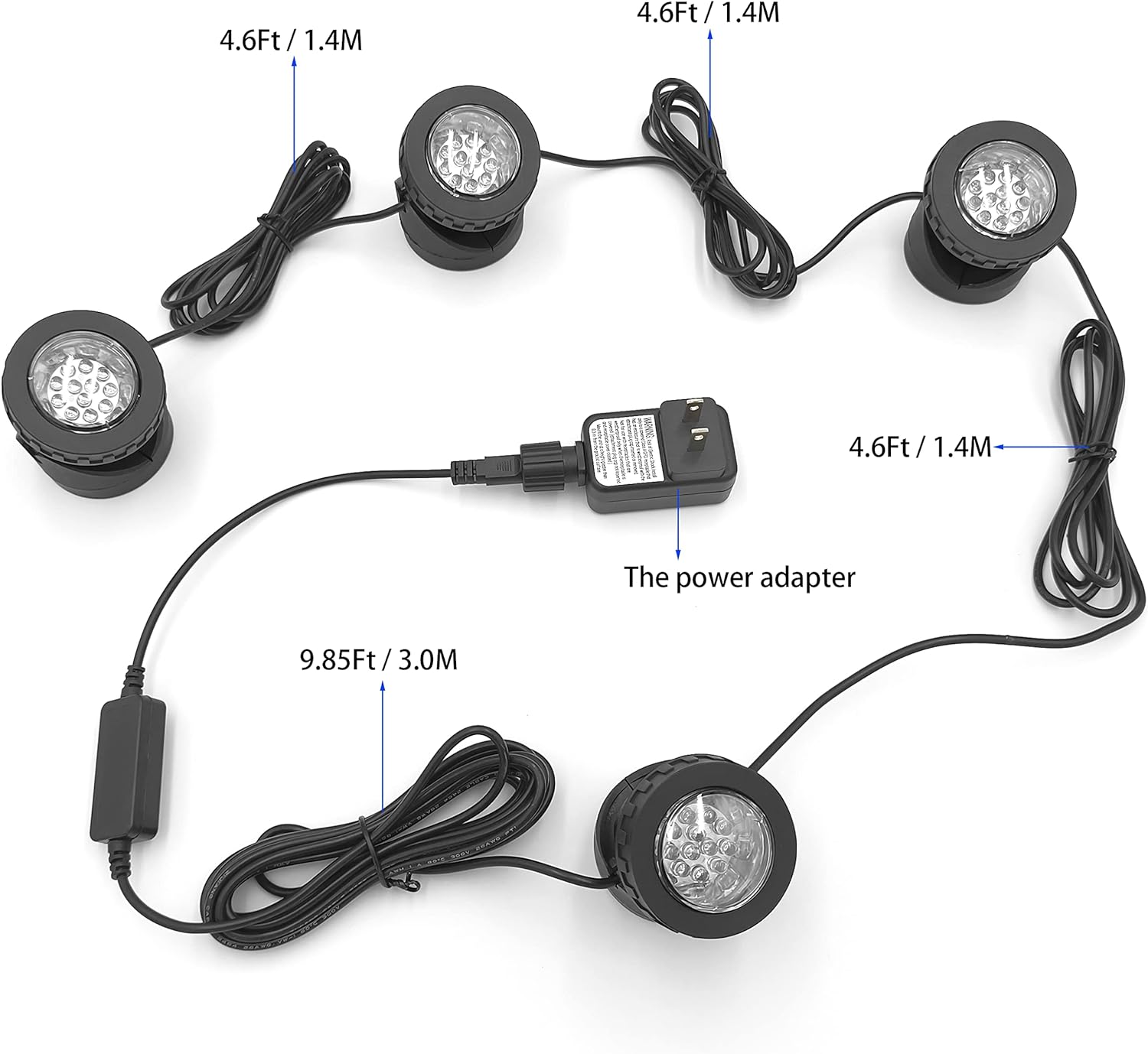 - 4 lights in 1 wire Pond Lights: This pond lights connected 4 lights in one wire, with one plug, the light heads can be adjusted 90 degrees, easy to install and use.