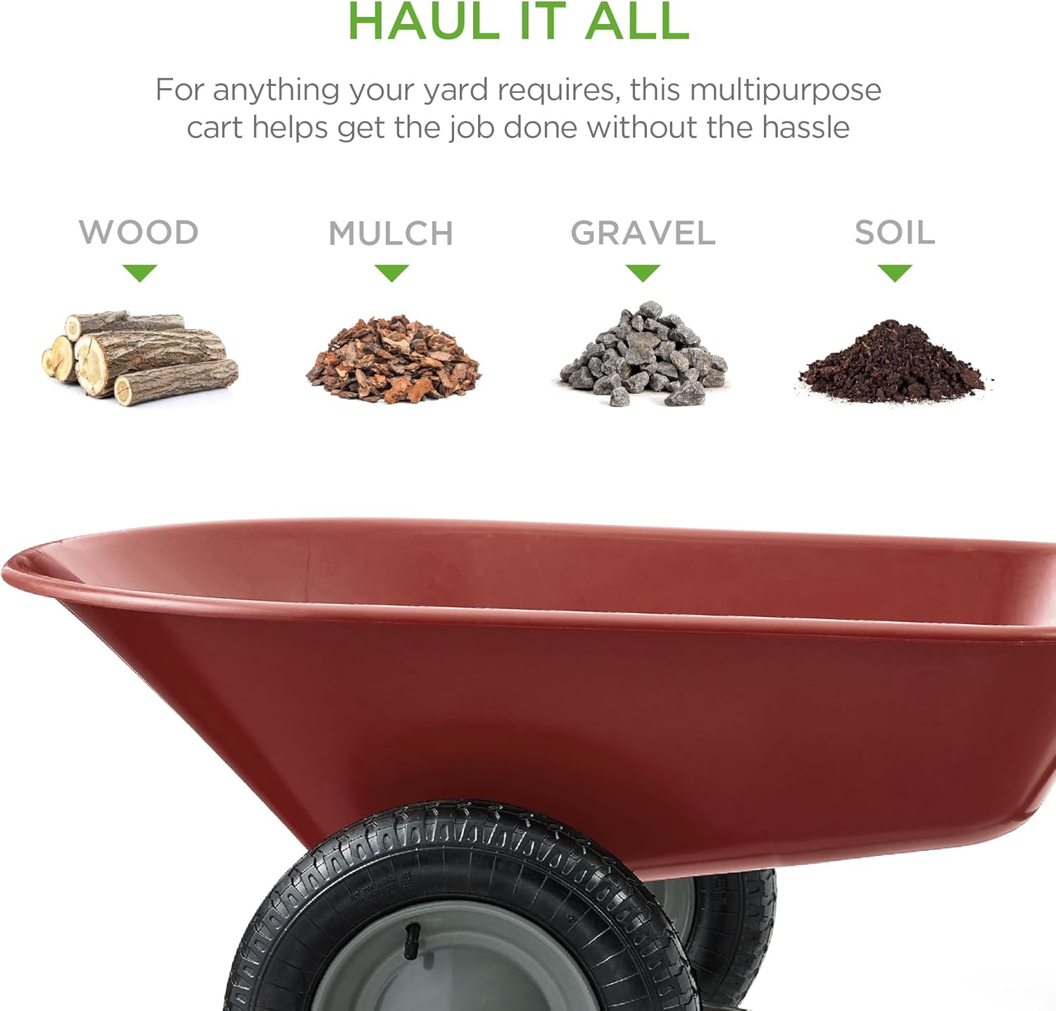 - MULTIPURPOSE GARDEN CART: Deep wheelbarrow holds up to 5 cubic feet of soil, bricks, mulch, gravel, and more, so you can conveniently carry out landscaping and other home improvement projects