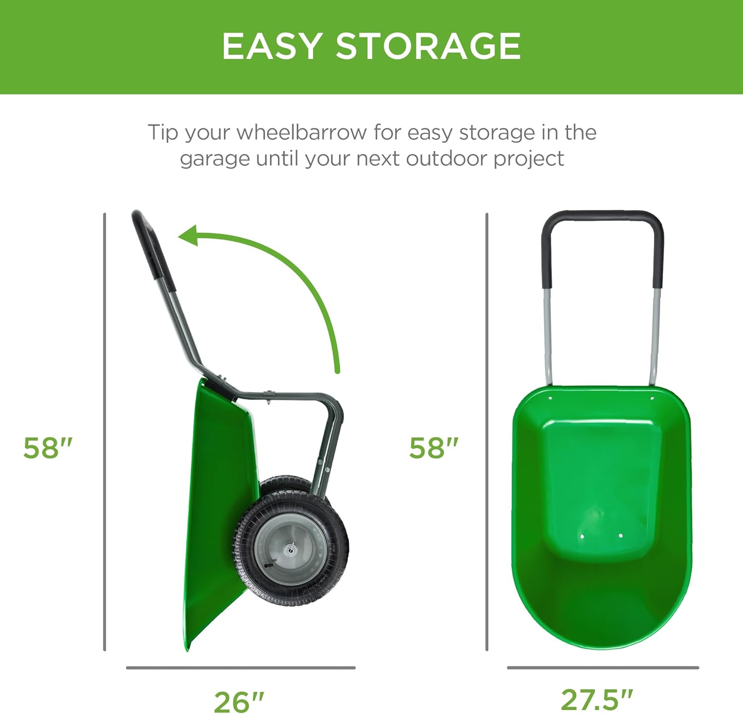 - EASY STORAGE: A compact profile combined with easy tipping action allows you to seamlessly store this wheelbarrow upright in your garage or garden shed; OVERALL DIMENSIONS: 58"(L) x 27.5"(W) x 26"(H); Weight Capacity: 330 lbs.