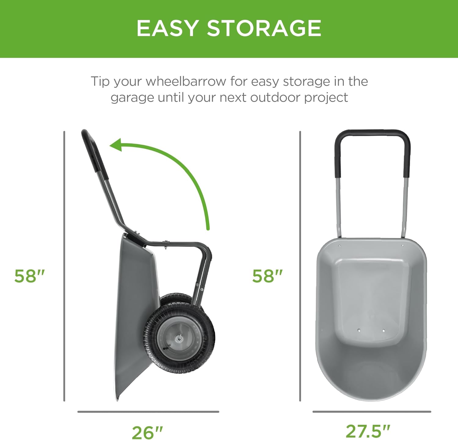 - EASY STORAGE: A compact profile combined with easy tipping action allows you to seamlessly store this wheelbarrow upright in your garage or garden shed; OVERALL DIMENSIONS: 58"(L) x 27.5"(W) x 26"(H); Weight Capacity: 330 lbs.