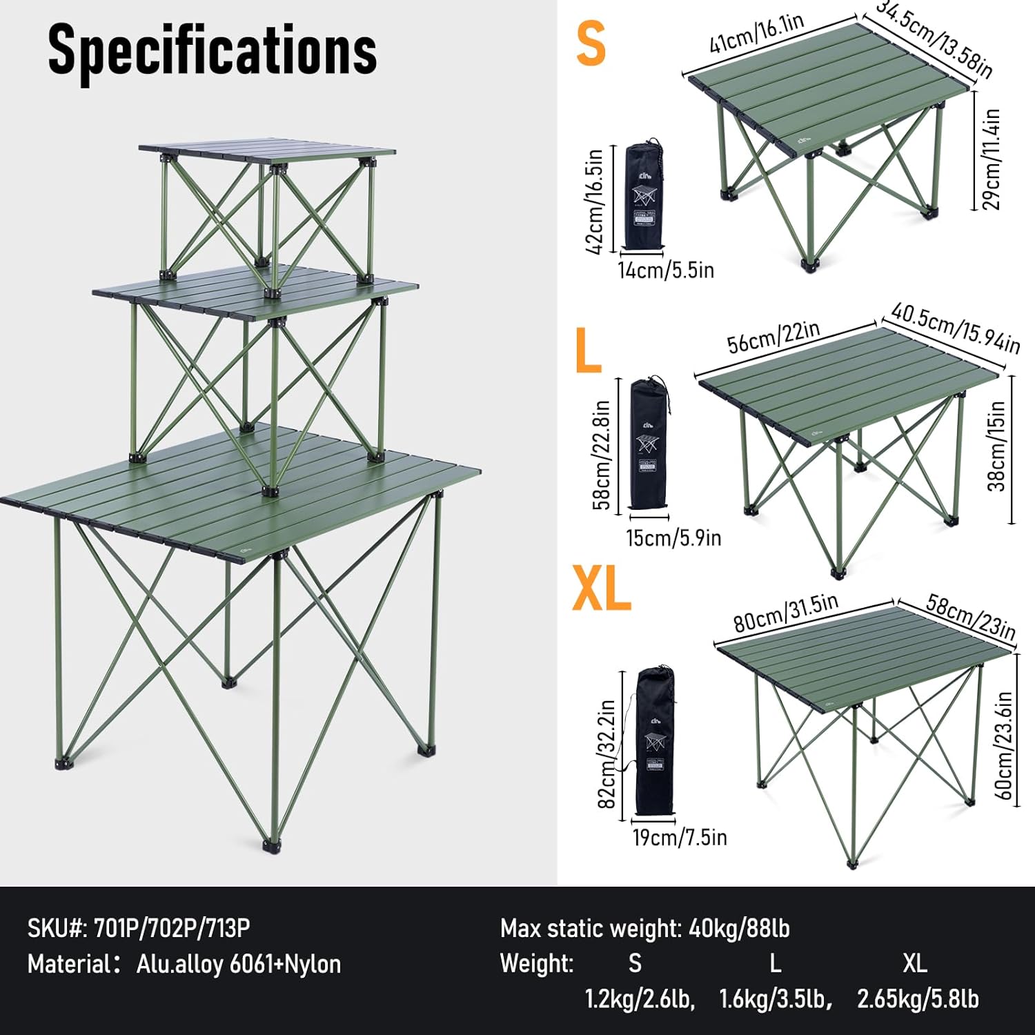 - Ultralight, made of aerospace-grade aluminum alloy, only 2.6 lbs; Max Load 88 lbs; Unlike wooden or nylon-top tables, this table is durable, waterproof, corrosion-resistant, easy to clean; Sturdy joints and anti-slip feet keep the table stable, with legs that wonโt fold, bend, or slip on any terrain; Very easy to set up, just open the base frame and attach the tabletop, enjoy your leisure time in seconds, video guide available on this page.
