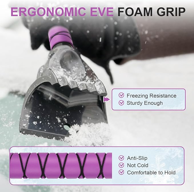 - 【Comfortable Ergonomic Design】: Featuring an elastic EVE cotton handle, our snow brush is designed to be non-slip and comfortable to hold in winter weather. Plus, it can be extended from 22" to 33" to suit your needs, ensuring comfort all winter.
