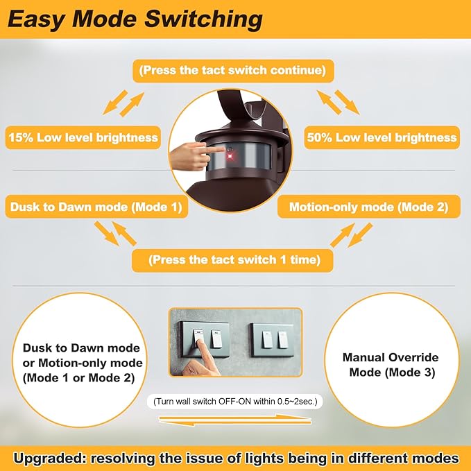 - Motion Activated & Dusk to Dawn Sensor: Our motion sensor outdoor light has 3 lighting modes: 1. Dusk-to-Dawn MODE: With 15-50% adjustable dim light at night, activated with 100% light once motion detected, revert to dim light after 120s without movement; 2. Motion-Only MODE: Keep off at night, 100% light once motion detected, revert to full off brightness without movement; 3. Manual Override MODE: Keep full brightness whole night. Light will automatically turn off during the dawn in each mode