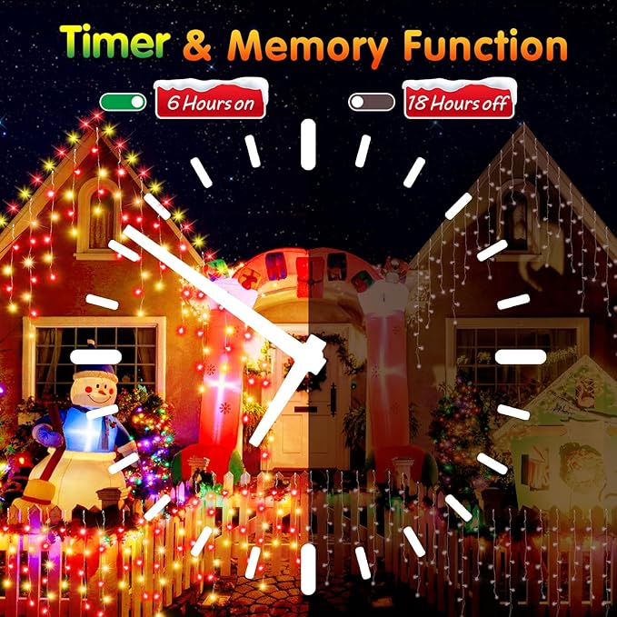 - 【Timer and Memory Function】Our waterproof string lights are equipped with a timer . The timer feature enables you to schedule automatic on and off times for the lights, helping you save energy and ensuring they remain illuminated as needed. Meanwhile, the memory function retains the last lighting mode you used, eliminating the need for frequent adjustments. This enhances the convenience and efficiency of managing your outdoor decor, offering hassle-free operation .