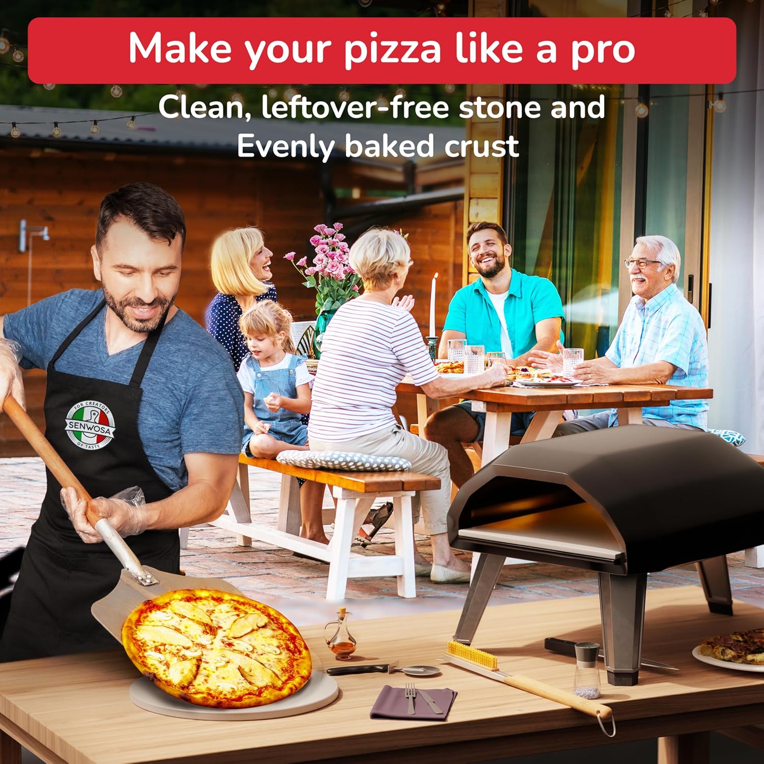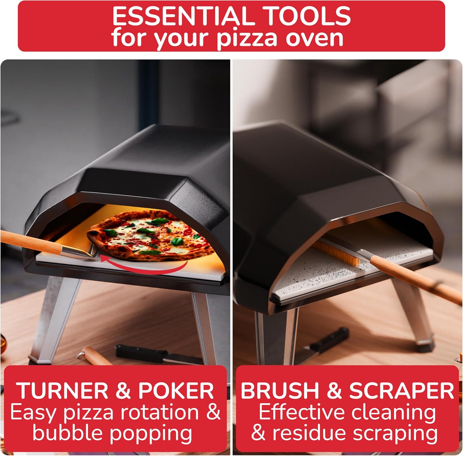 - Efficient Design: The brush includes a built-in scraper for tough residues, and with the turner fork, rotating pizzas is now easier than ever, ensuring perfectly even cooking and bubble management.