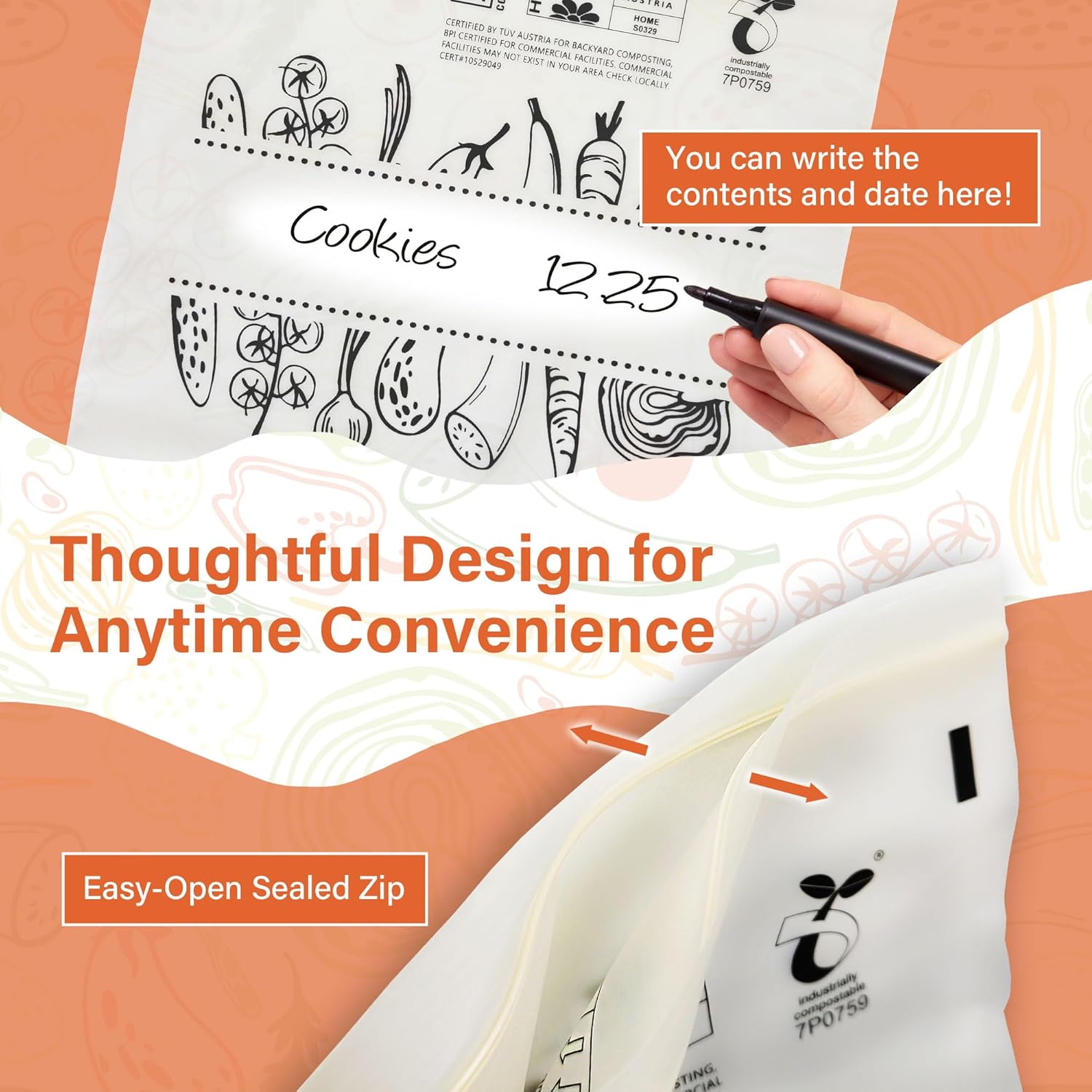 - Durable, Eco-friendly, and Safe: The food storage bags lock in freshness with a secure, leak-proof seal. Compostable, BPA-free, and non-toxic, they’re ideal for daily use and freezer storage. Easy to use and tough enough for a variety of foods, they provide a reliable, eco-conscious solution for all your storage needs.