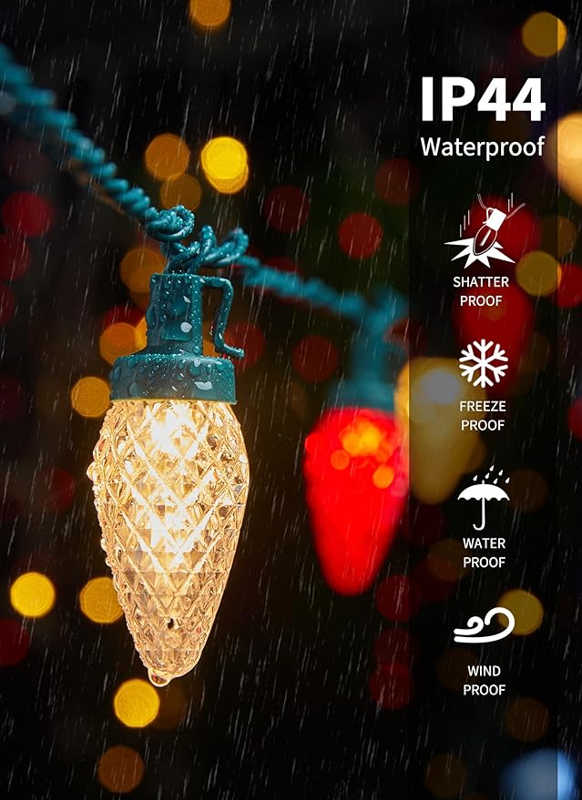 - Waterproof Shatterproof Blue and Warm White Christmas Lights: Designed with impact-resistant, shatterproof C9 LED bulbs that withstand drops; Christmas outdoor lights are IP44 waterproof, and can withstand extreme temperatures, rain, wind, and damp climates, ensuring durability and safety, suitable for both indoor and outdoor use