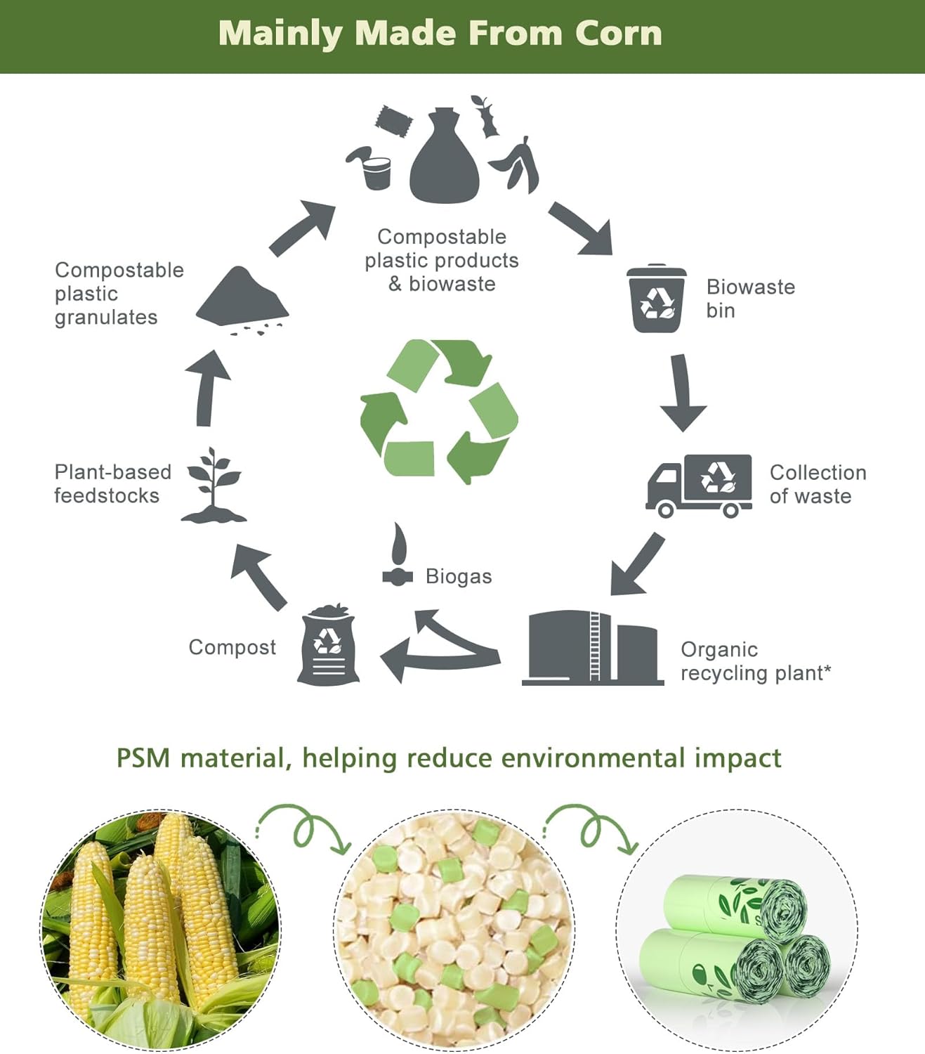 - From Corn to Compost: AYOTEE compostable small trash bags 1.6 gallon are made from plant-based materials, mainly corn starch, to ensure they do no harm to the environment. These compost bin bags meet ASTM series compostable standards and can be quickly degrade in municipal industrial composting facilities (under constant humidity at 50-60ยฐC) to eventually return to the earth in the form of water, CO2 and biomass