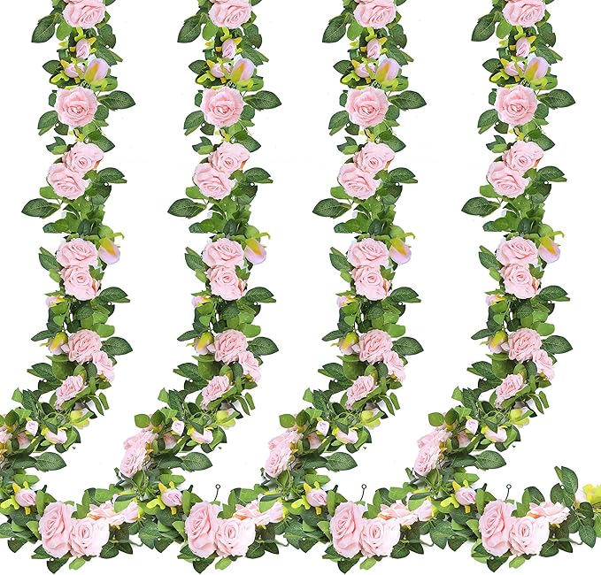 Sggvecsy 4Pcs 31Ft Artificial Rose Vine Fake Flower Garland Floral Garland Faux Silk Hanging Vine Rose Ivy Vines for Wedding Arch Party Wall Garden Ceremony Background Outdoor Decor (Pink)