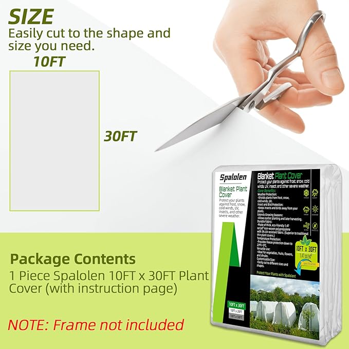 - Easy to Use and Versatile: Spalolen frost protection covers are easy to cut to the desired size, making them suitable for individual plants, garden rows, or entire beds. They can also be paired with hoops or frames (not included) for elevated protection. Whether you're protecting shrubs, vegetables, or flowers, Spalolen frost blankets offer reliable protection all season long.