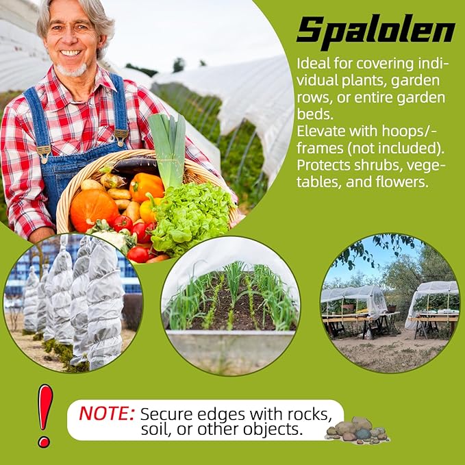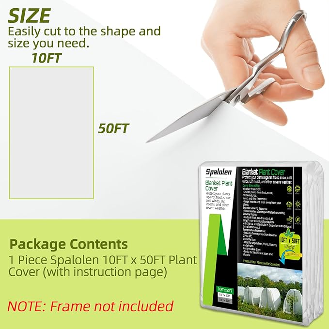 - Easy to Use and Versatile: Spalolen frost protection covers are easy to cut to the desired size, making them suitable for individual plants, garden rows, or entire beds. They can also be paired with hoops or frames (not included) for elevated protection. Whether you're protecting shrubs, vegetables, or flowers, Spalolen frost blankets offer reliable protection all season long.
