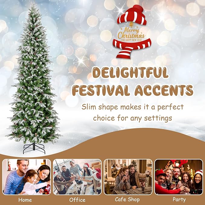 GOFLAME 9 FT Pre-Lit Pencil Christmas Tree Snow Flocked, Slim Artificial Xmas Tree with 1310 Branch Tips, 470 LED Lights, 98 Natural Pine Cones, Hinged Holiday Decoration Tree for Home Office