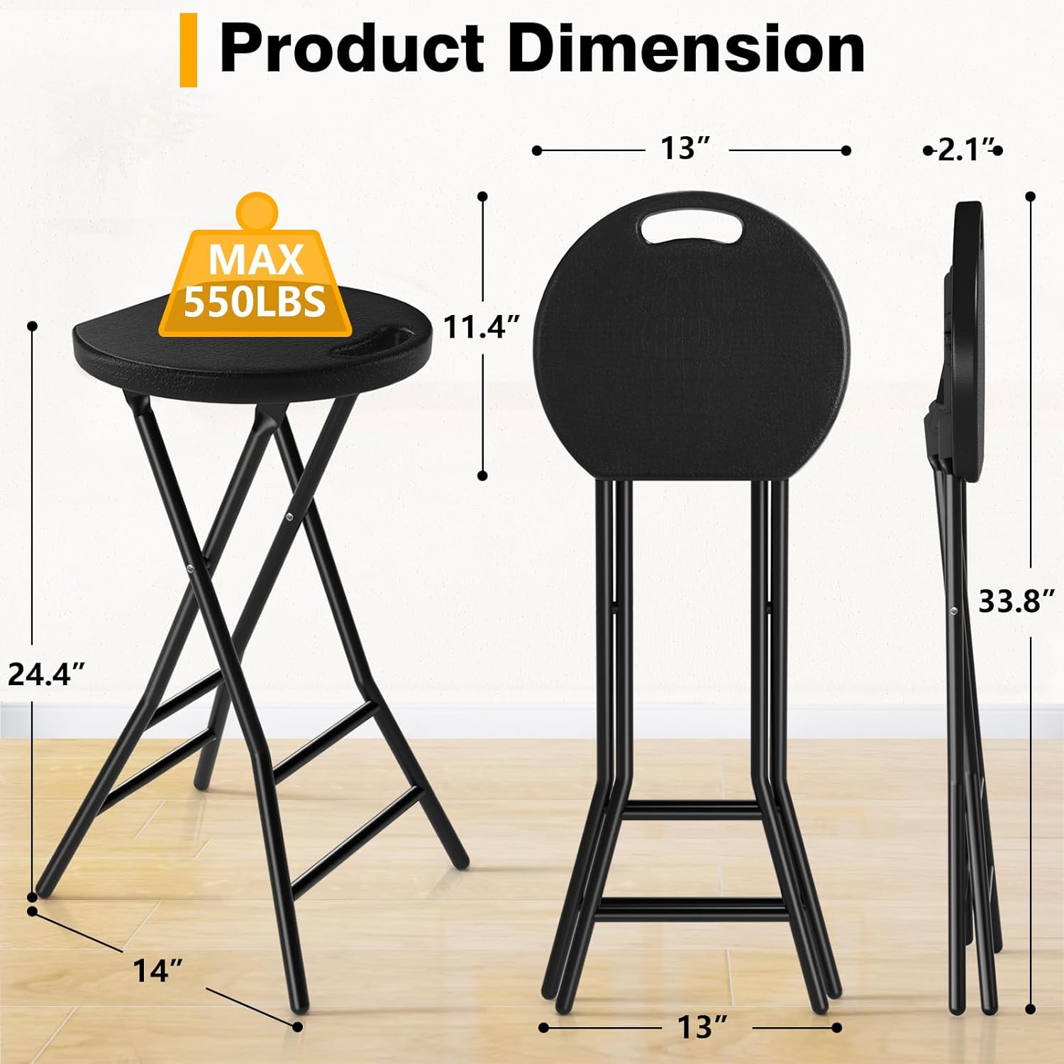 - Easy To Carry - Open Dimensions: 13" L x 14" W x 24.4" H. Folded Dimensions: 13"L x 2.1"W x 33.8"H. This plastic desk stool has a carry handle in it. Easy to carry and suitable for indoor and outdoor use. 24 inch stool weighs 6 pounds each and can be easily carried anywhere for parties and shows.