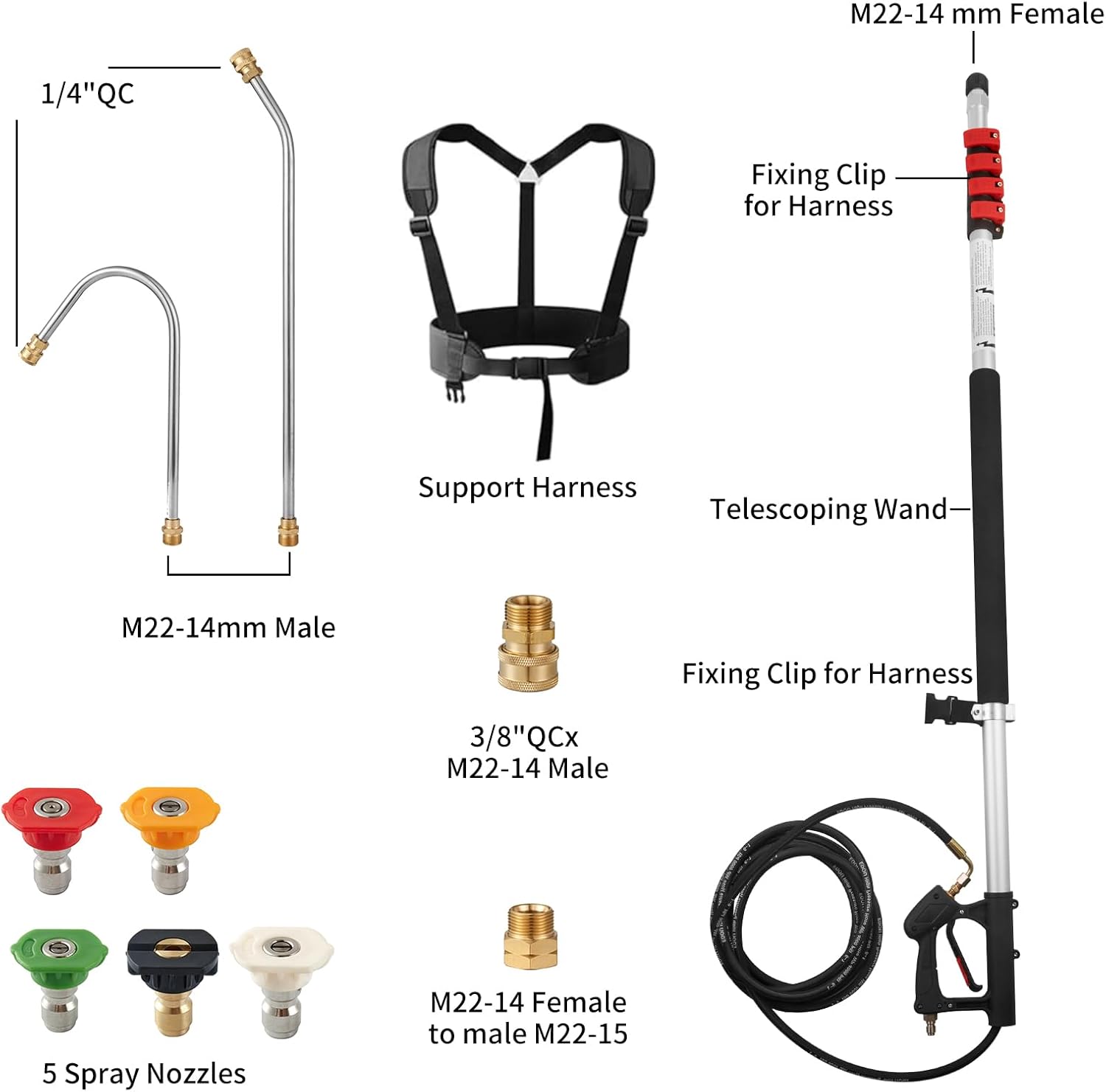 - ăEssential Accessoriesă2 extension wands(15 degrees & gutter cleaner) are ideal for cleaning different places;5 different spray angle nozzles meet your cleaning needs;2 hose adapters fit most pressure washer hose, Lengthened support belt can help you save physical strength in use and a thread seal tape(thick)