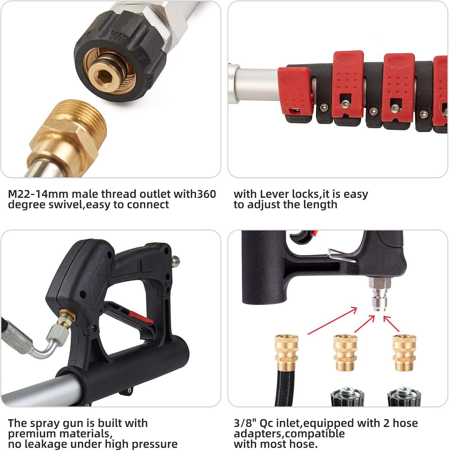 - ăGOOD COMPATIBILITYăM22-14mm male thread outlet keeps extension wands stable.Equipped with 2 hose adapters,3/8'' QC inlet fits most pressure washer hose.It works with pressure washers rated up to 4,000 PSI