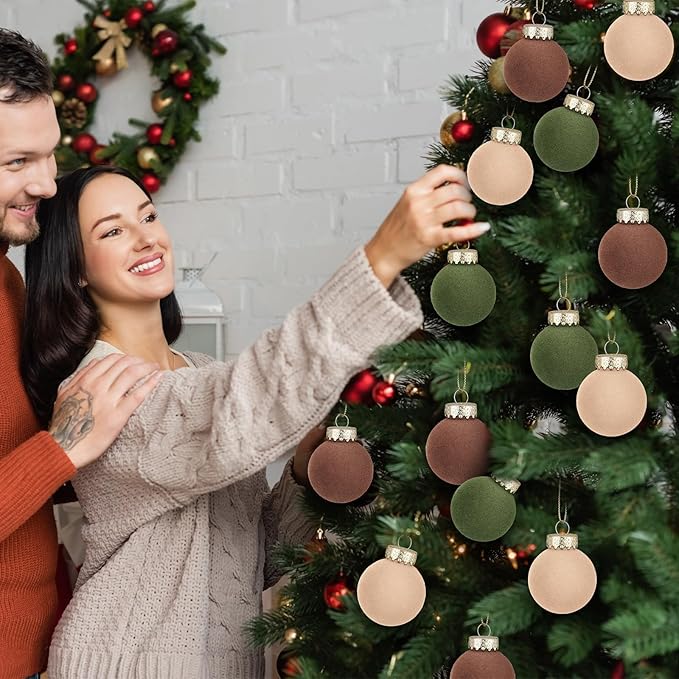 12 Pcs Velvet Christmas Balls Flocked Christmas Tree Hanging Ornaments Shatterproof Plastic Hanging Balls Decorations for Xmas Tree Party Home Holiday Decor (Brown, Green, Beige, 2.36 inch)