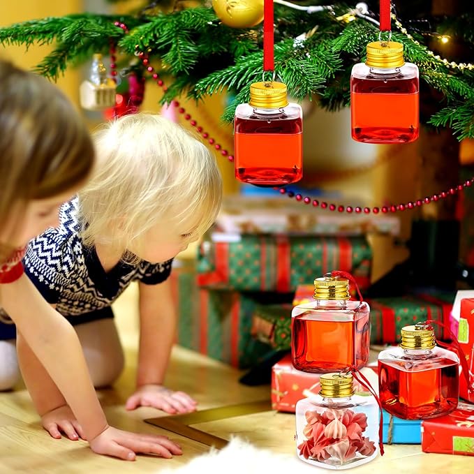 - Product Information: the package provides you 18 pieces fillable square bottle ball featuring classic color secure screw-top lids with ribbons for hanging on the top, fill them with anything from gin to whiskey to sweets, will be better way to keep your alcohol nearby over the festive period than by hanging it on your tree