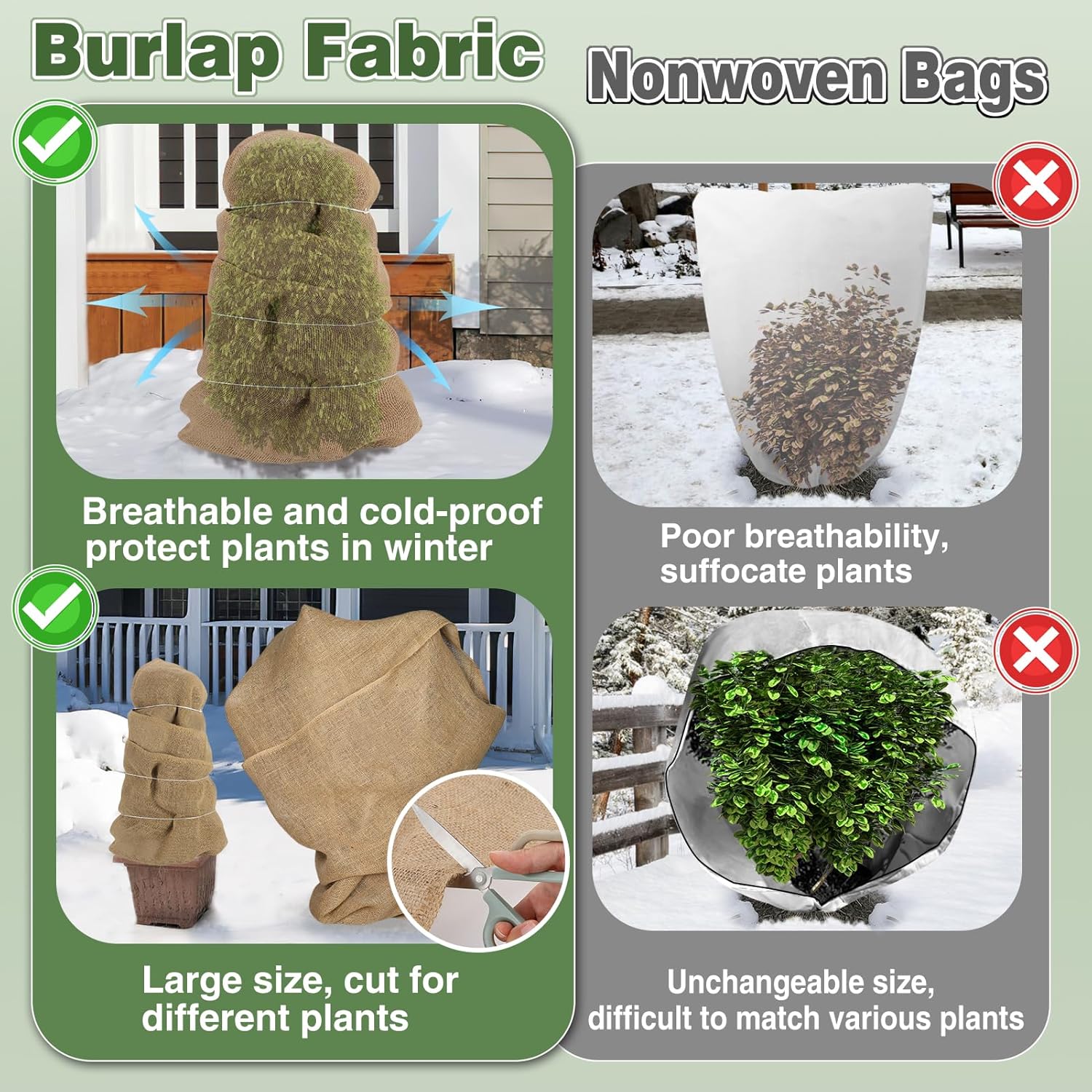 - Wide Application: Our burlap frost cloth is suitable for many plants, including outdoor potted plants, fruit trees, shrubs, landscape trees, and garden ornamentals. When vegetation is transplanted, this wrap also helps to keep the soil in place. Besides, you can also use our burlap to DIY planting bags, winter anti-skid mats, and so on.