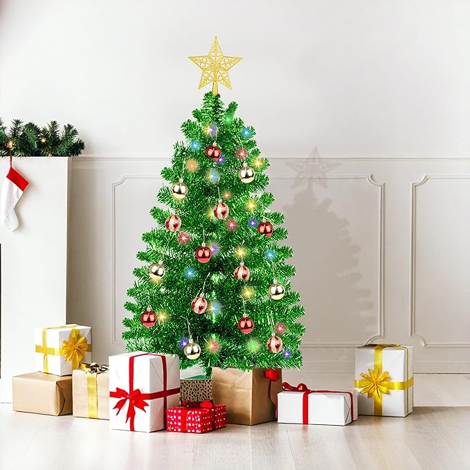 - [ Green Tinsel Christmas tree ]: The 3 Ft tall x 21 Inch wide tinsel christmas tree, includes 117 branch tips and 8.3 Inch Golden 3D star tree topper and 15 christmas ball ornaments 3 style (5 red gold screw thread ball, 5 red xmas ball, 5 gold xmas ball) for DIY assembly